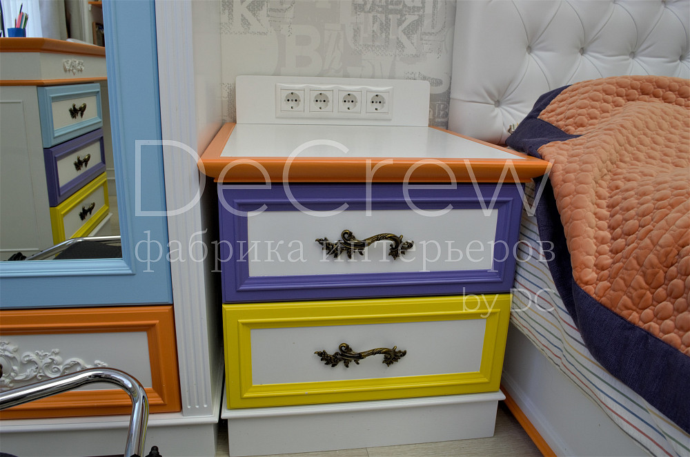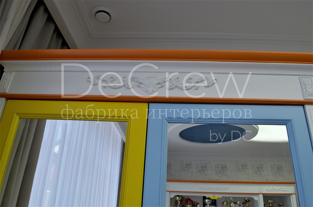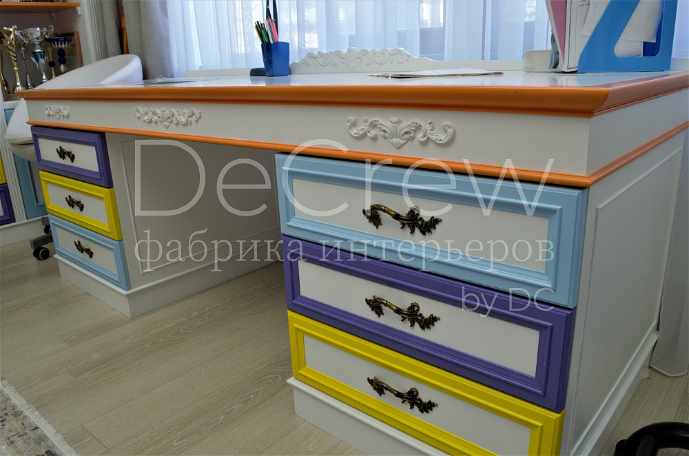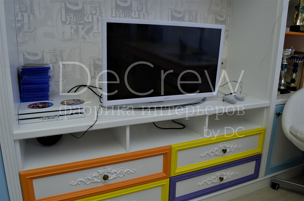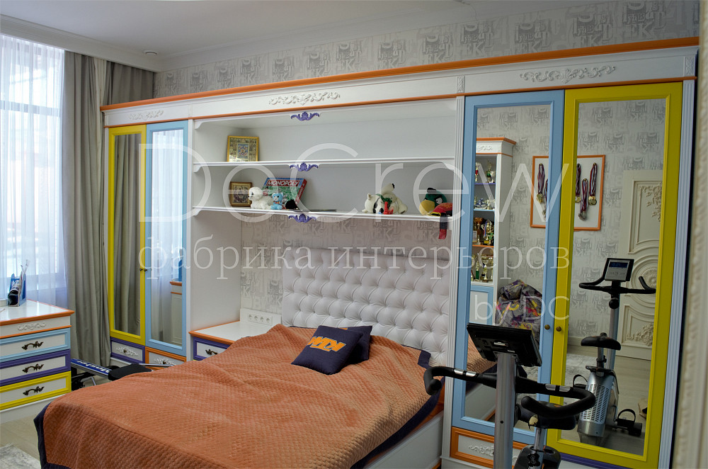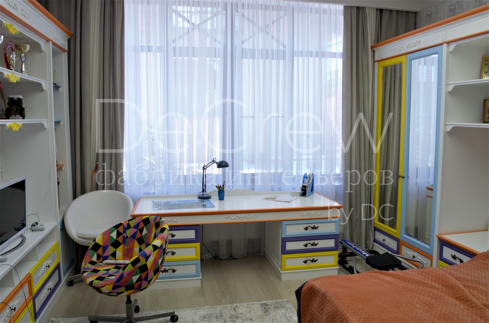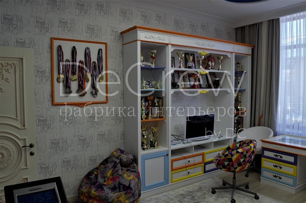 Детская спальня - комплект мебели для мальчика школьного возраста. С таким же успехом легко трансформируется и для девочки. Дизайн рассчитан на перспективу, т.к обычно пока делается спальня, сын уходит в армию и женится. Это не шутка. Размеры, декор, эргономика на самом деле вполне соответствуют солидной, представительной мебели для спальни. Достаточно закрасить цветные решения и ....взрослая спальня без грандиозных переделок.