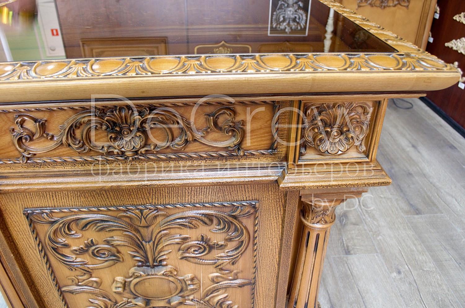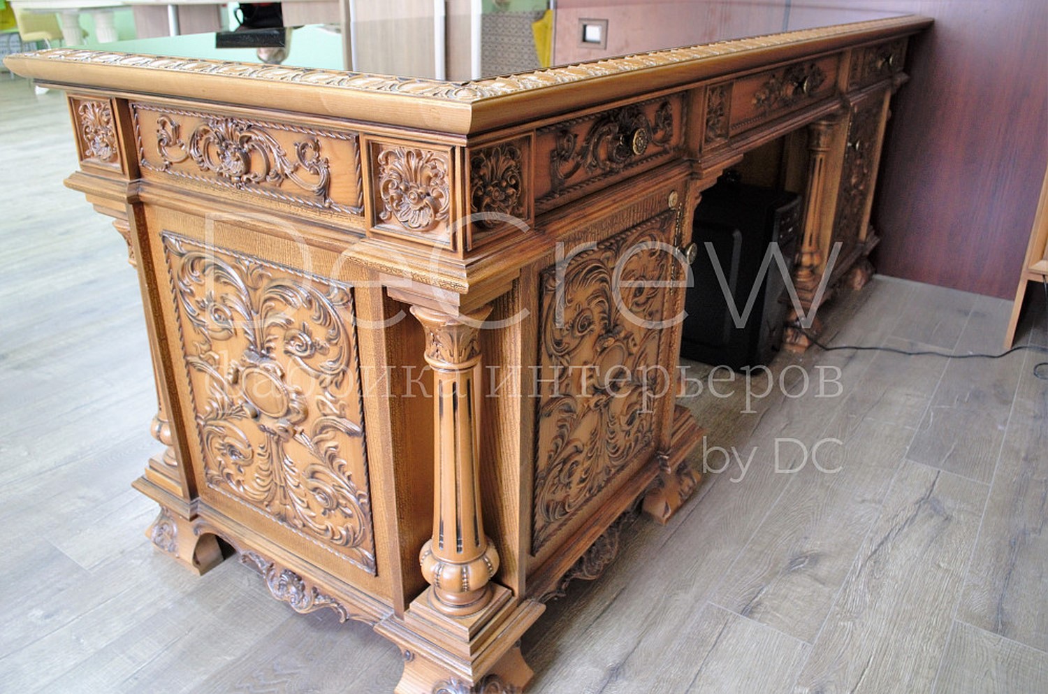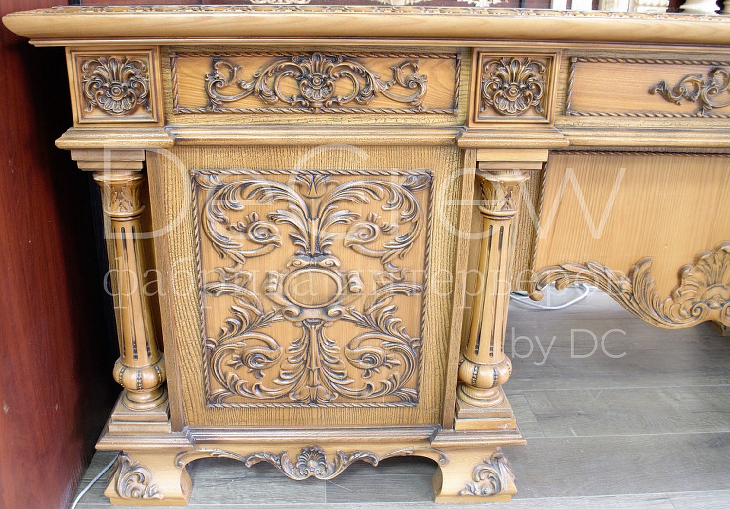 Расчитан на любителей роскошной, статусной мебели в лучших традициях классической школы. Подразумевает оформление всего кабинета в таком стиле. Возможно изготовление бриф-приставки, шкафов - гардеробов, зон ТV, консолей, дверей и стеновых панелей. Предлагается так же кесонные потолки и другие решения по их обработке. Такие проекты требуют индивидуальной проработки.