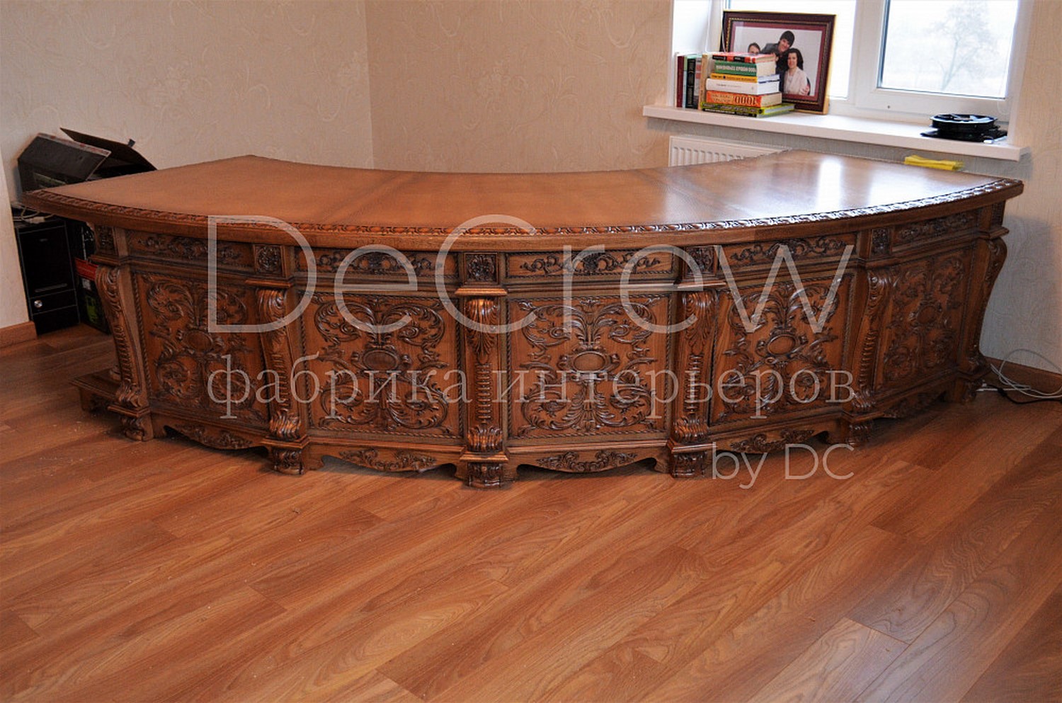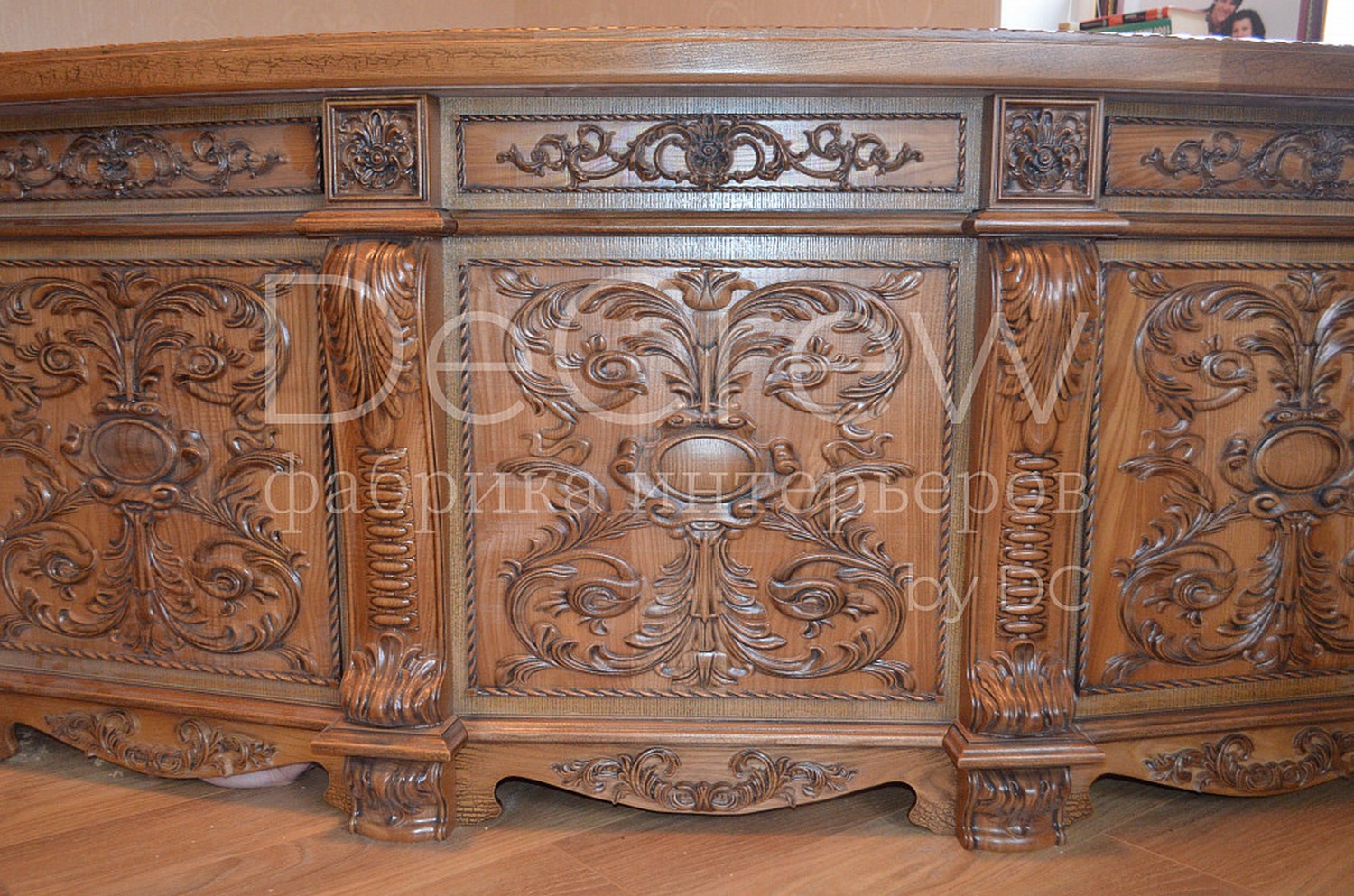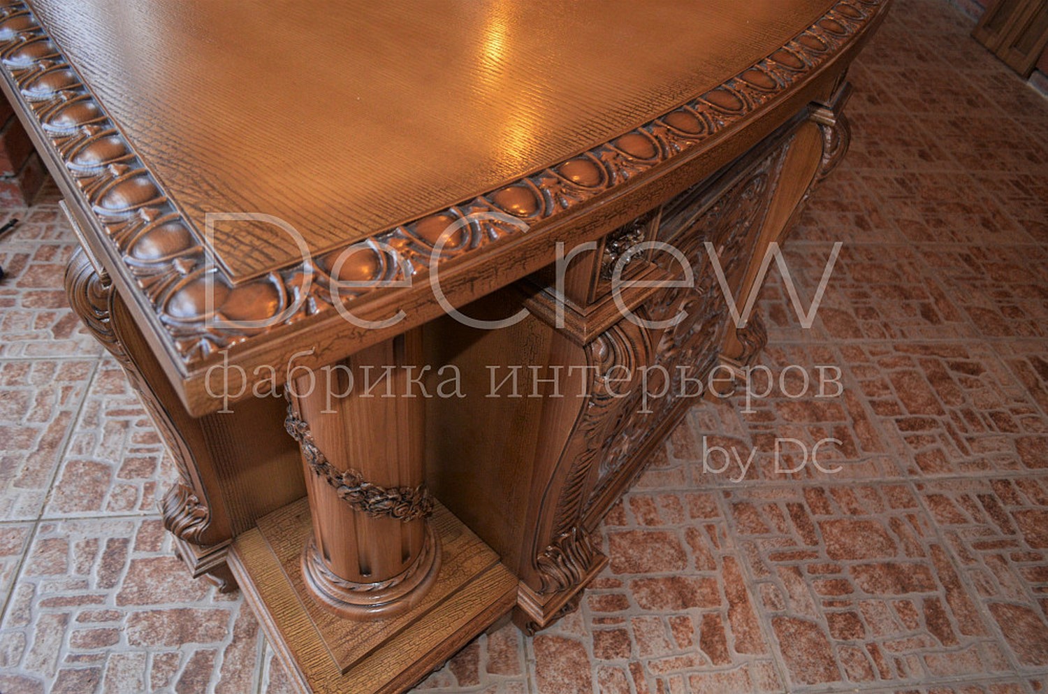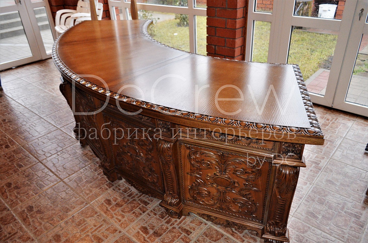 Радиусный стол руководителя в классическом стиле.Расчитан на любителей роскошной, статусной мебели в лучших традициях классической школы. Подразумевает оформление всего кабинета в таком стиле. Возможно изготовление бриф-приставки, шкафов - гардеробов, зон ТV, консолей, дверей и стеновых панелей. Предлагается так же кесонные потолки и другие решения по их обработке. Такие проекты требуют индивидуальной проработки. Столешница стола изготовлена так же и без стекла и камня, с коженной вставкой или специальной накладкой. В комплект можем быть включена тумба под орг. технику. Такие дела.