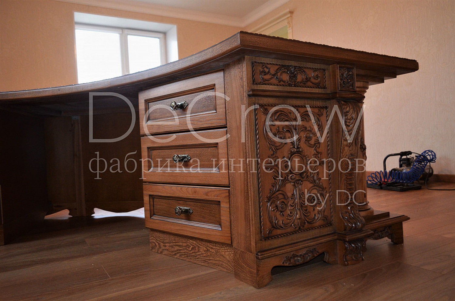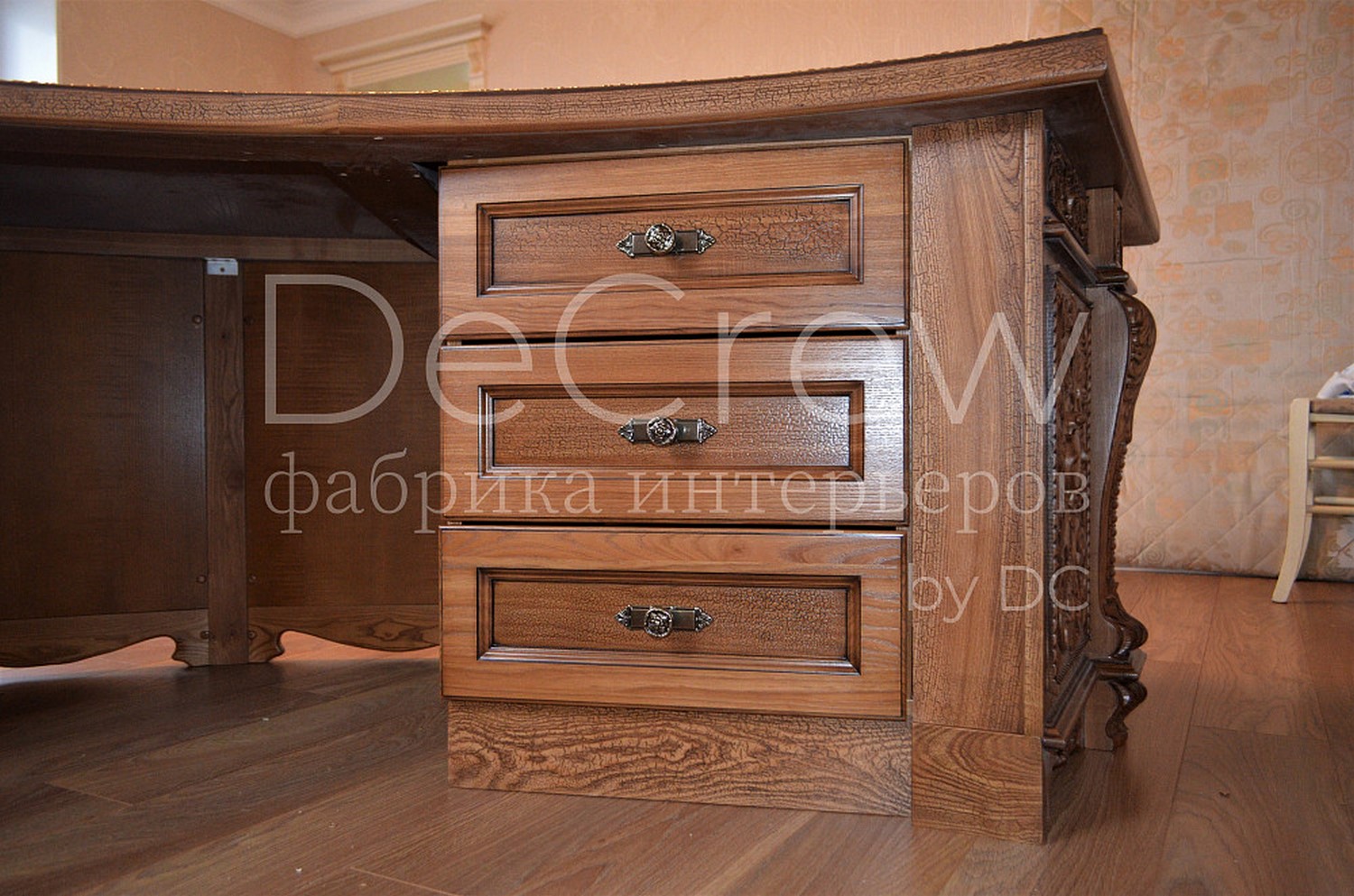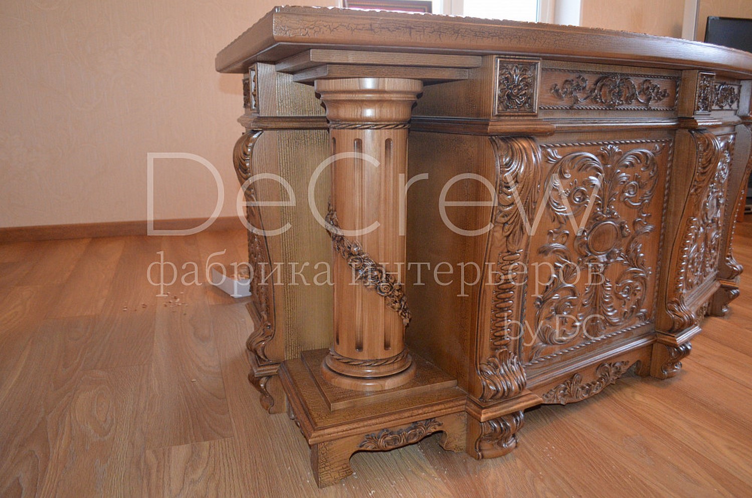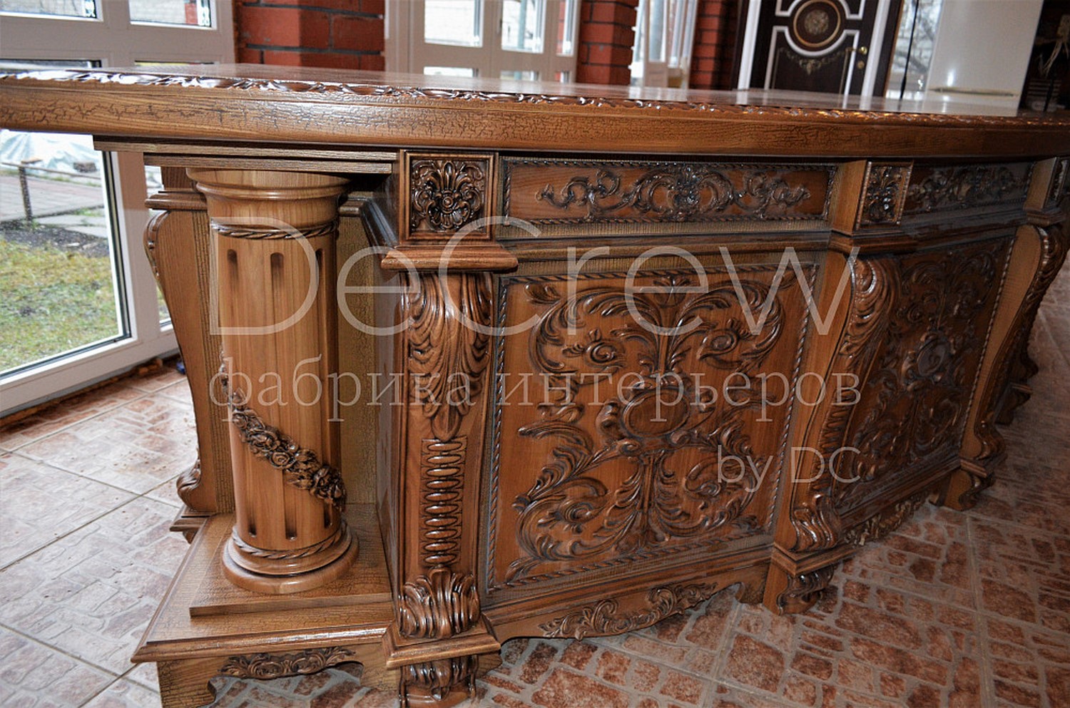 Радиусный стол руководителя в классическом стиле.Расчитан на любителей роскошной, статусной мебели в лучших традициях классической школы. Подразумевает оформление всего кабинета в таком стиле. Возможно изготовление бриф-приставки, шкафов - гардеробов, зон ТV, консолей, дверей и стеновых панелей. Предлагается так же кесонные потолки и другие решения по их обработке. Такие проекты требуют индивидуальной проработки. Столешница стола изготовлена так же и без стекла и камня, с коженной вставкой или специальной накладкой. В комплект можем быть включена тумба под орг. технику. Такие дела.