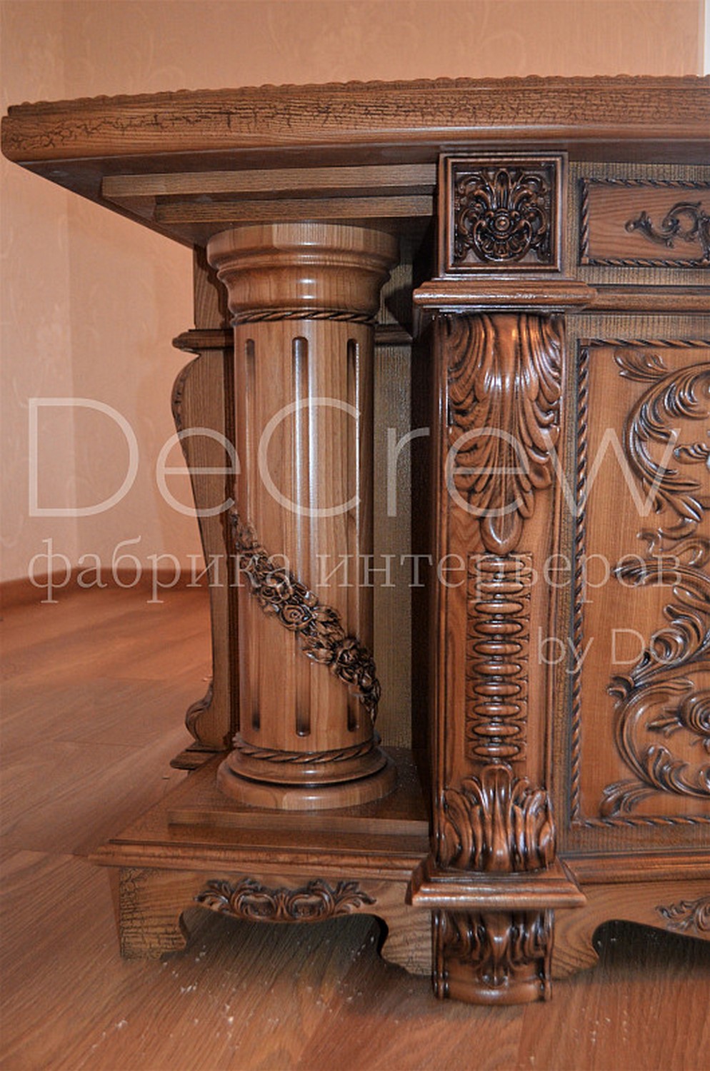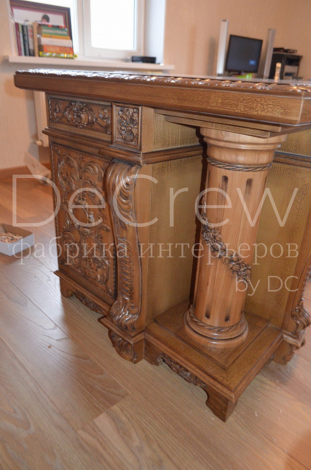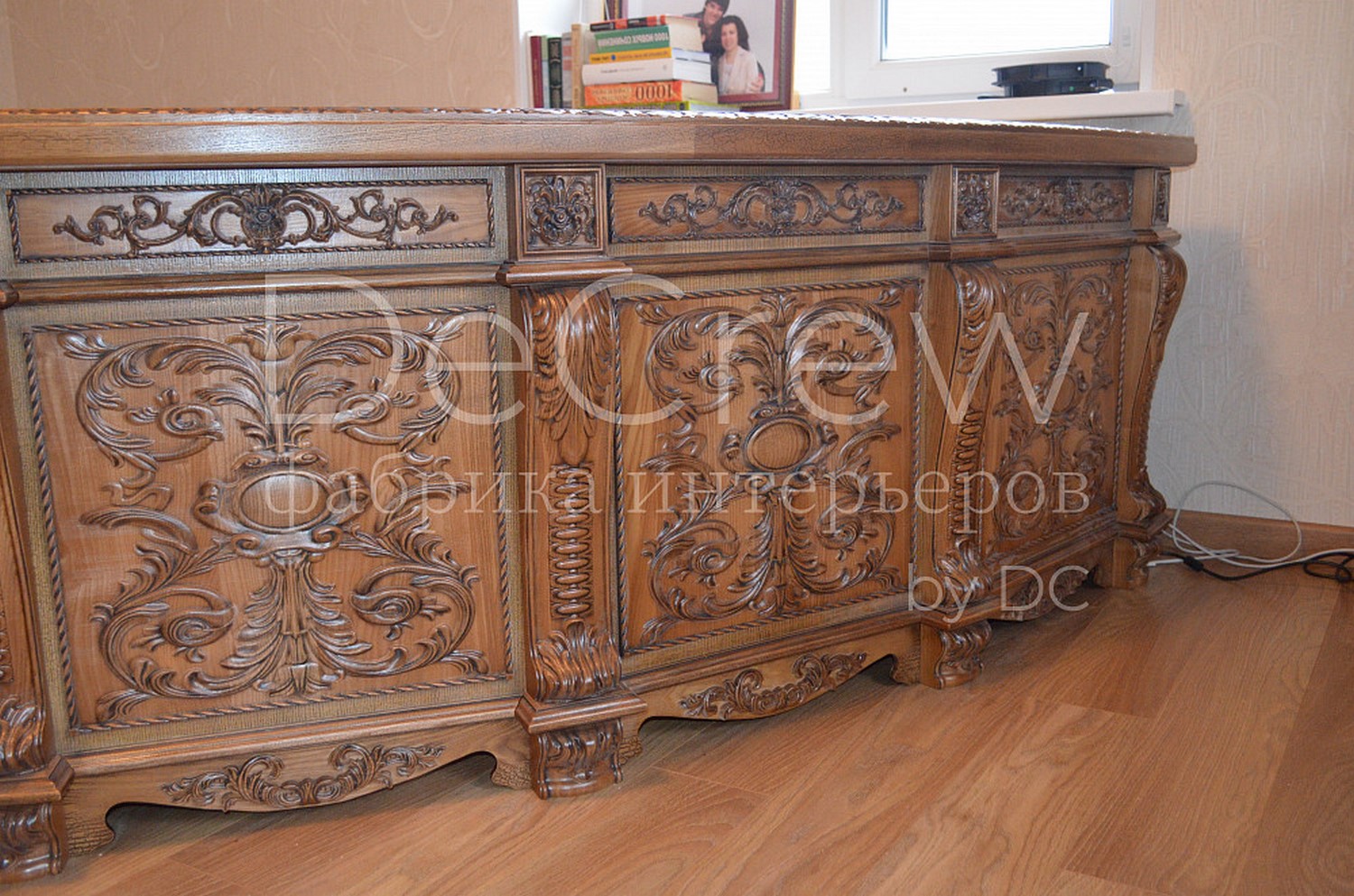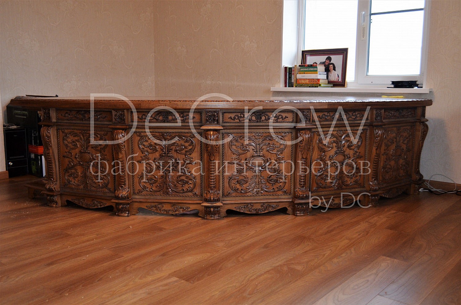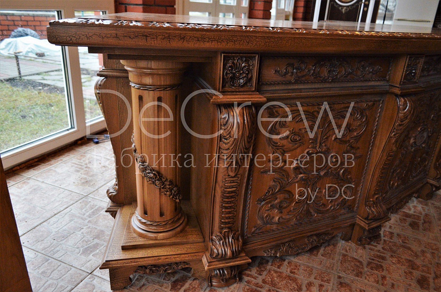 Радиусный стол руководителя в классическом стиле.Расчитан на любителей роскошной, статусной мебели в лучших традициях классической школы. Подразумевает оформление всего кабинета в таком стиле. Возможно изготовление бриф-приставки, шкафов - гардеробов, зон ТV, консолей, дверей и стеновых панелей. Предлагается так же кесонные потолки и другие решения по их обработке. Такие проекты требуют индивидуальной проработки. Столешница стола изготовлена так же и без стекла и камня, с коженной вставкой или специальной накладкой. В комплект можем быть включена тумба под орг. технику. Такие дела.