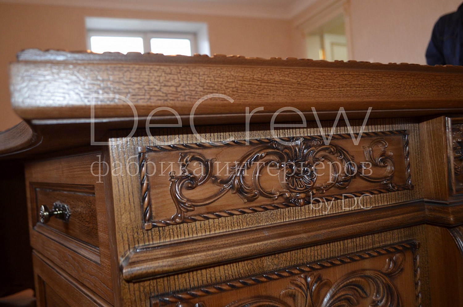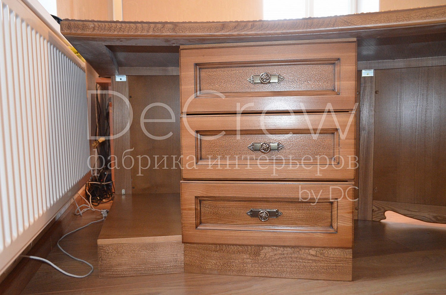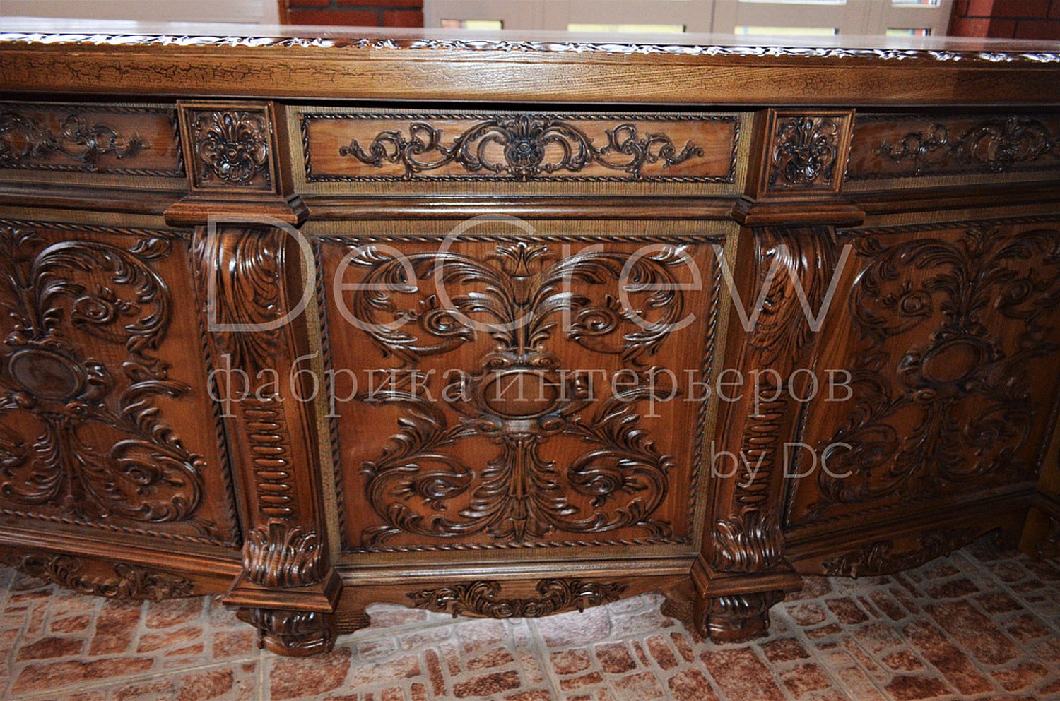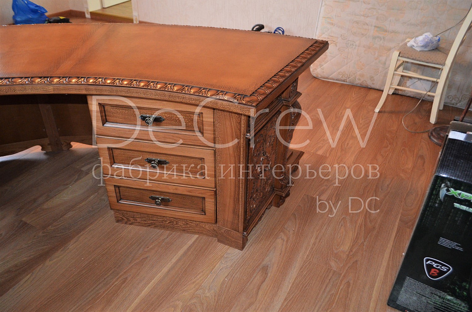 Радиусный стол руководителя в классическом стиле.Расчитан на любителей роскошной, статусной мебели в лучших традициях классической школы. Подразумевает оформление всего кабинета в таком стиле. Возможно изготовление бриф-приставки, шкафов - гардеробов, зон ТV, консолей, дверей и стеновых панелей. Предлагается так же кесонные потолки и другие решения по их обработке. Такие проекты требуют индивидуальной проработки. Столешница стола изготовлена так же и без стекла и камня, с коженной вставкой или специальной накладкой. В комплект можем быть включена тумба под орг. технику. Такие дела.