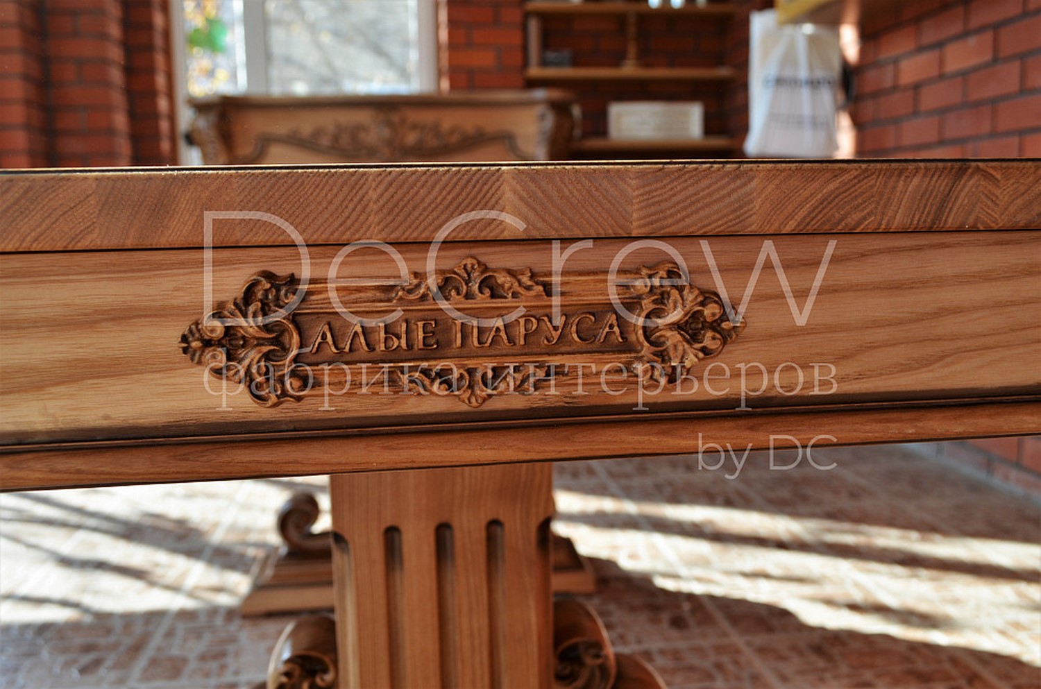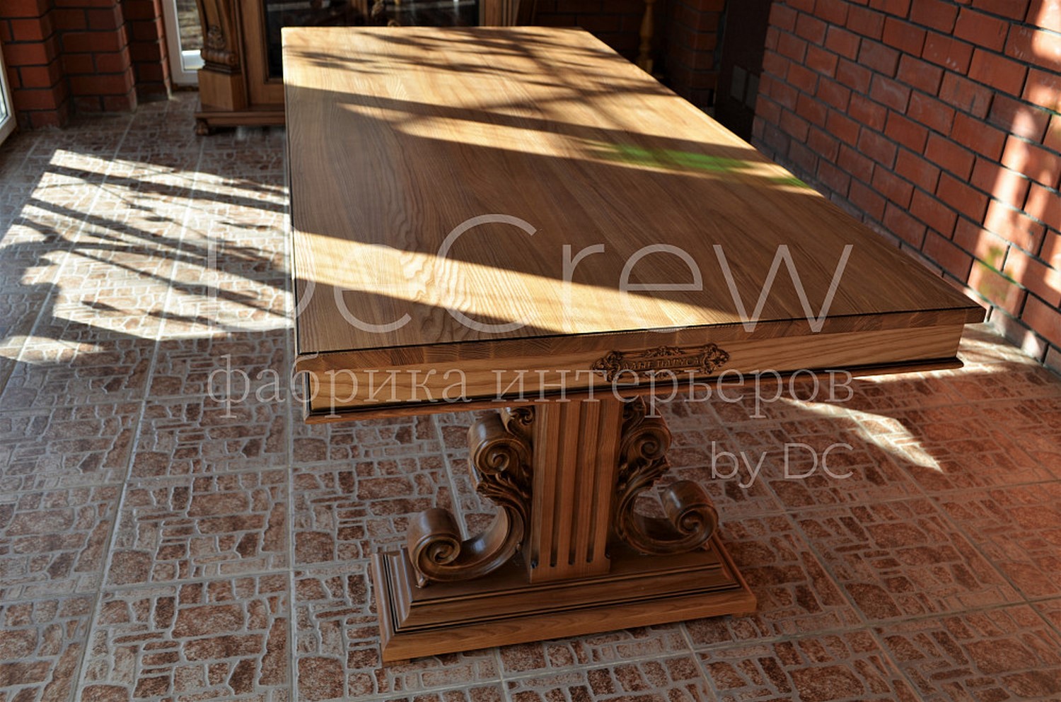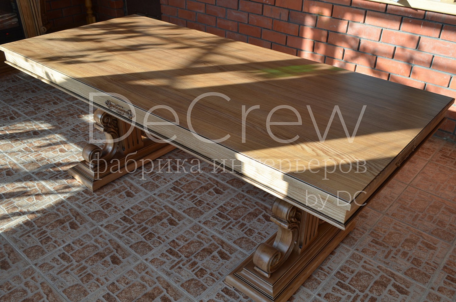 Сделан из массива ясеня. Предусмотрен вариант столешницы из шпонированного мдф в целях удешевления модели. Столы производятся различных размеров в зависимости от размеров помещения. Декоративные резные элементы стола могут стилизоваться под конкретный дизайн. Конструкция стола имеет запас прочности необходимый для общественного заведения.