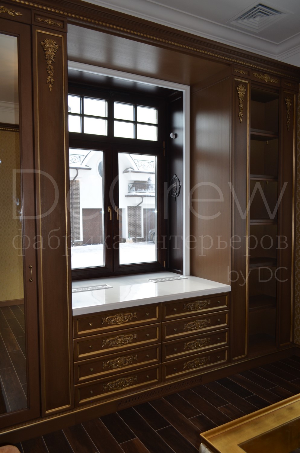 - Левая открытая секция - Центральная секция с оконным проемом - Отдельный двустворчатый шкаф |