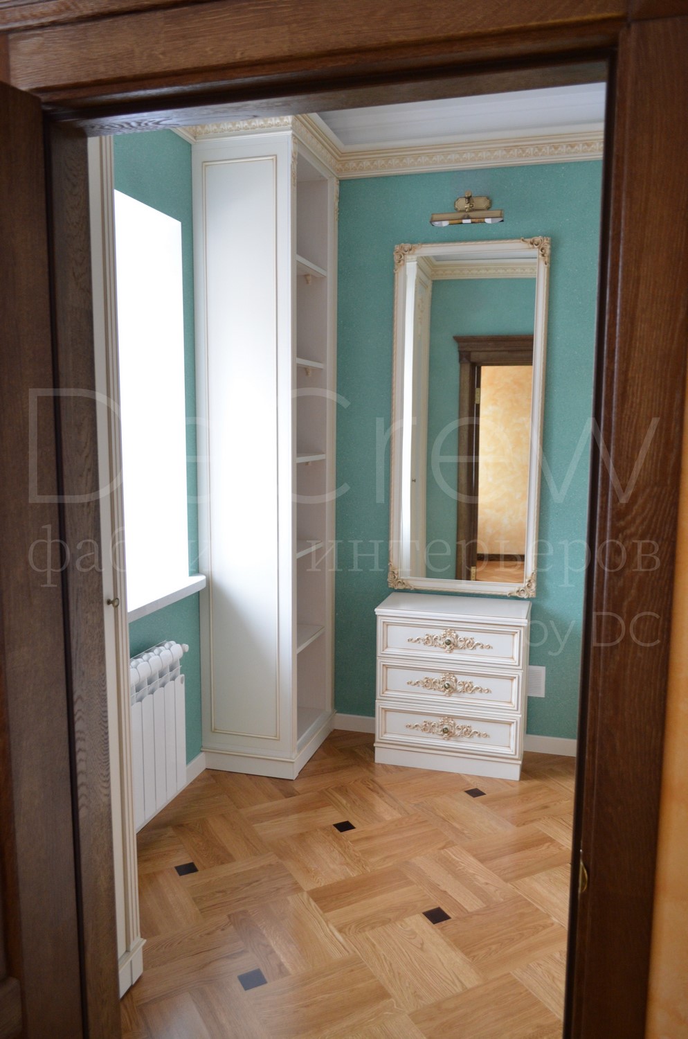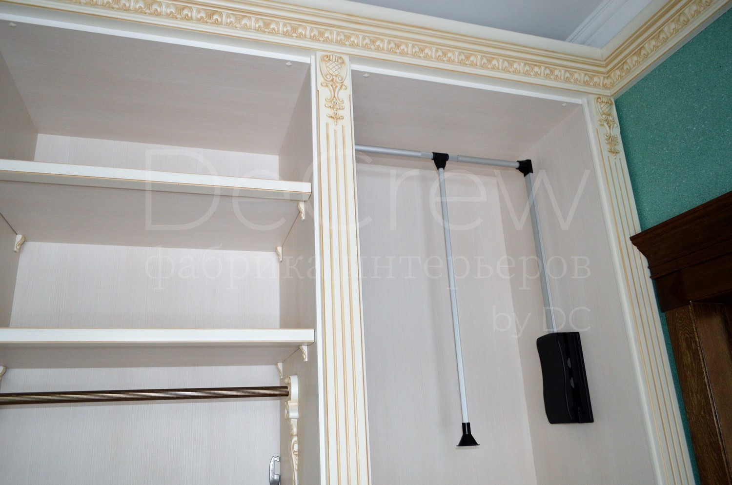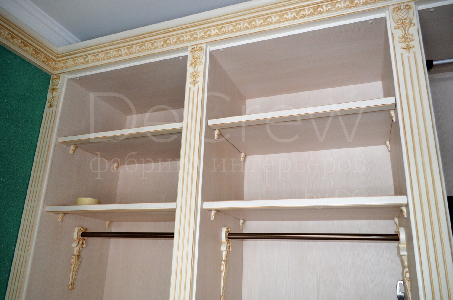 - Двустворчатый шкаф - Открытый пенал - Зеркало в резной раме - Тумба - Основная открытая секция |