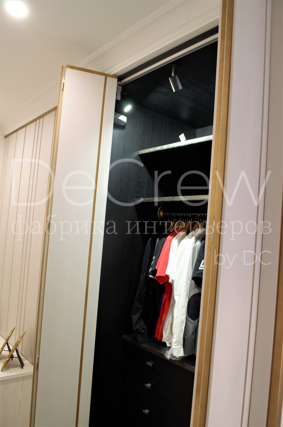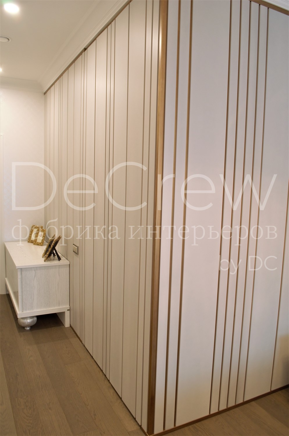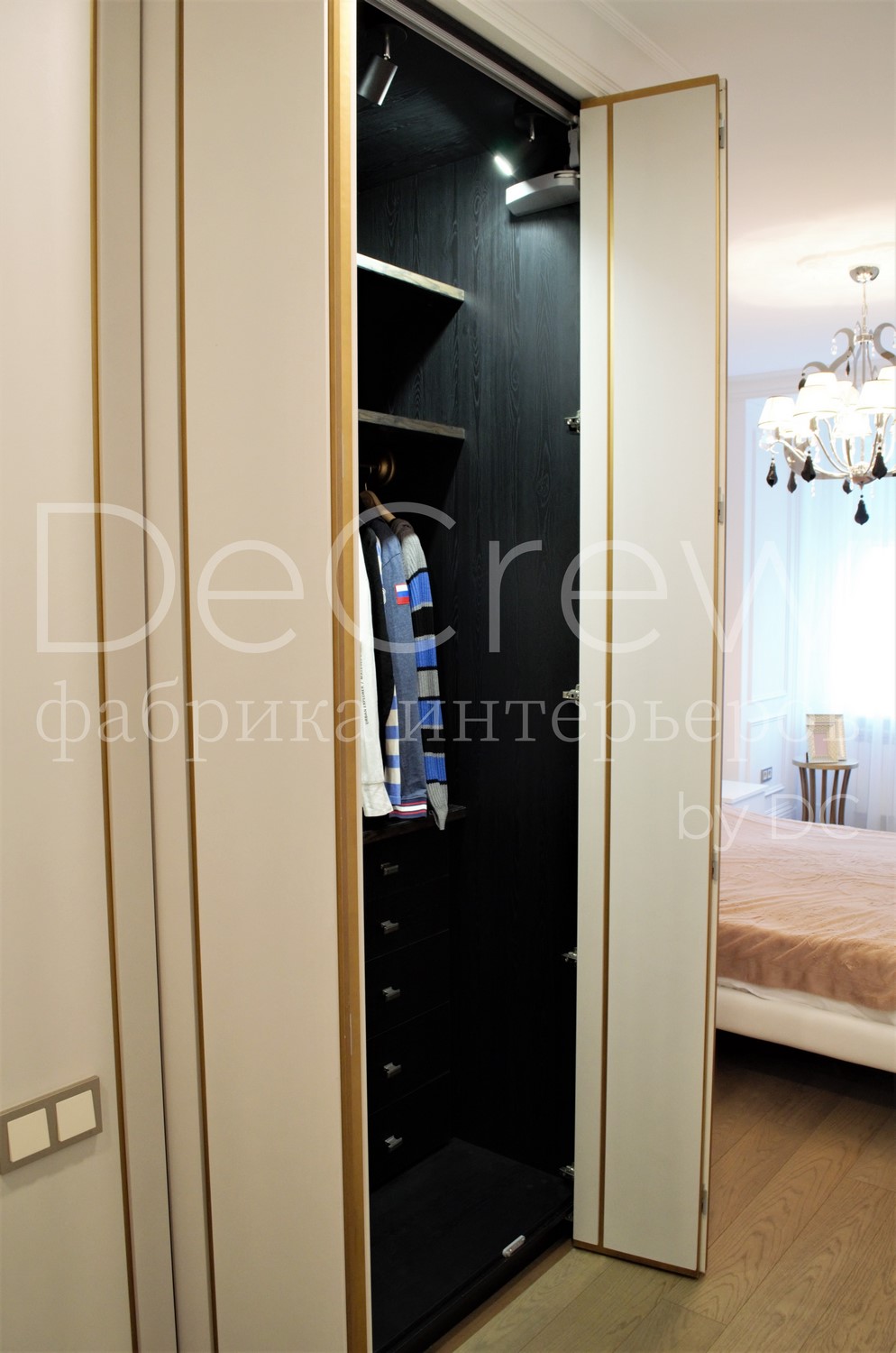 Гардероб в спальной визуально скрытый стеновыми панелями - решение дизайнеров. Фасадные двери гардероба складные, имитирующие панели.