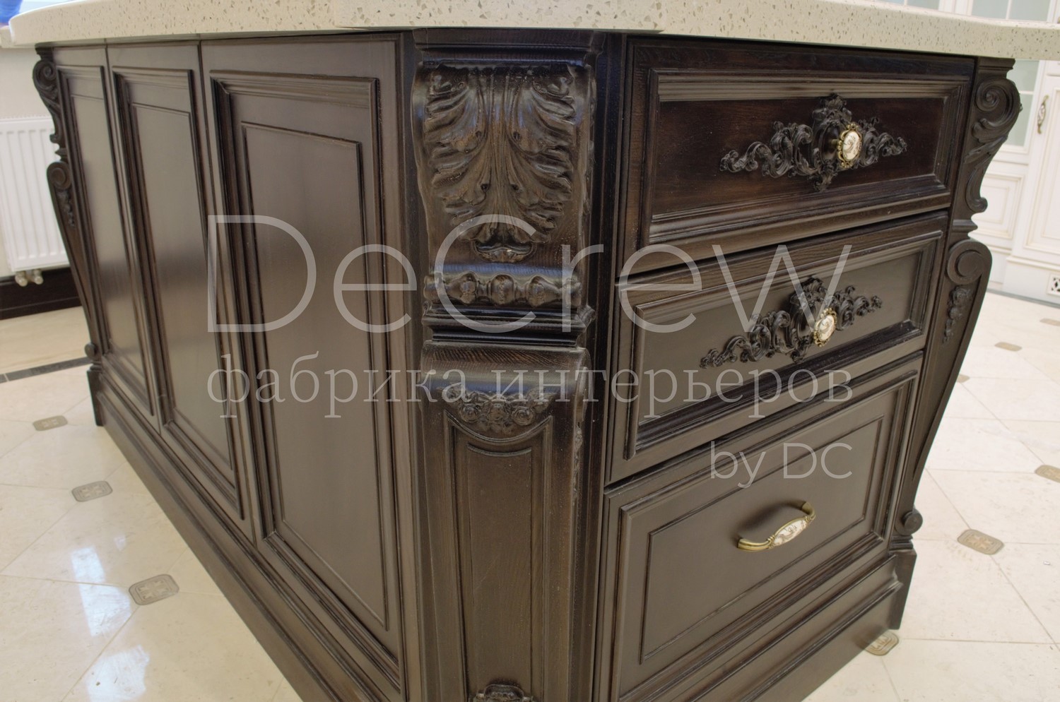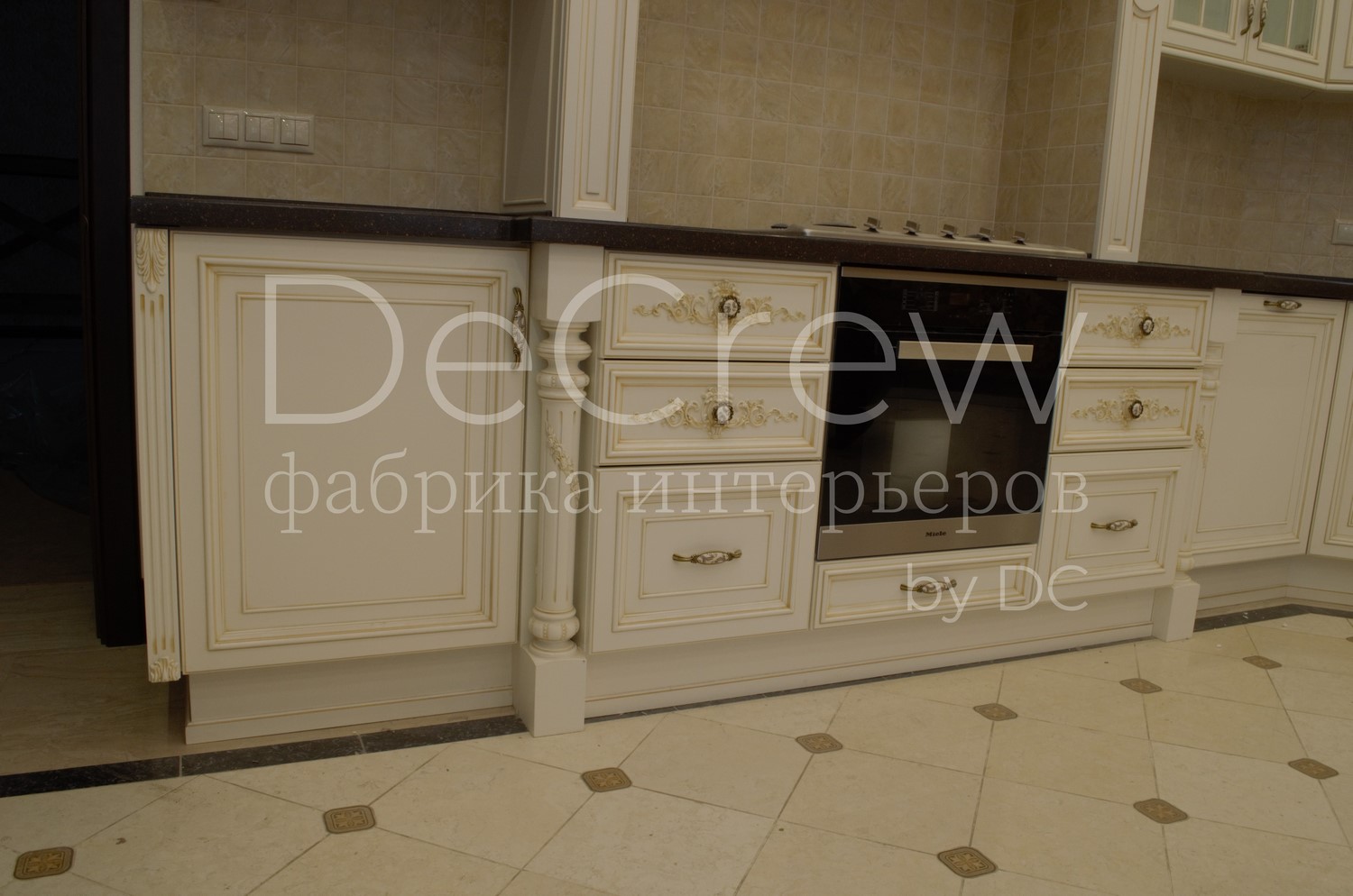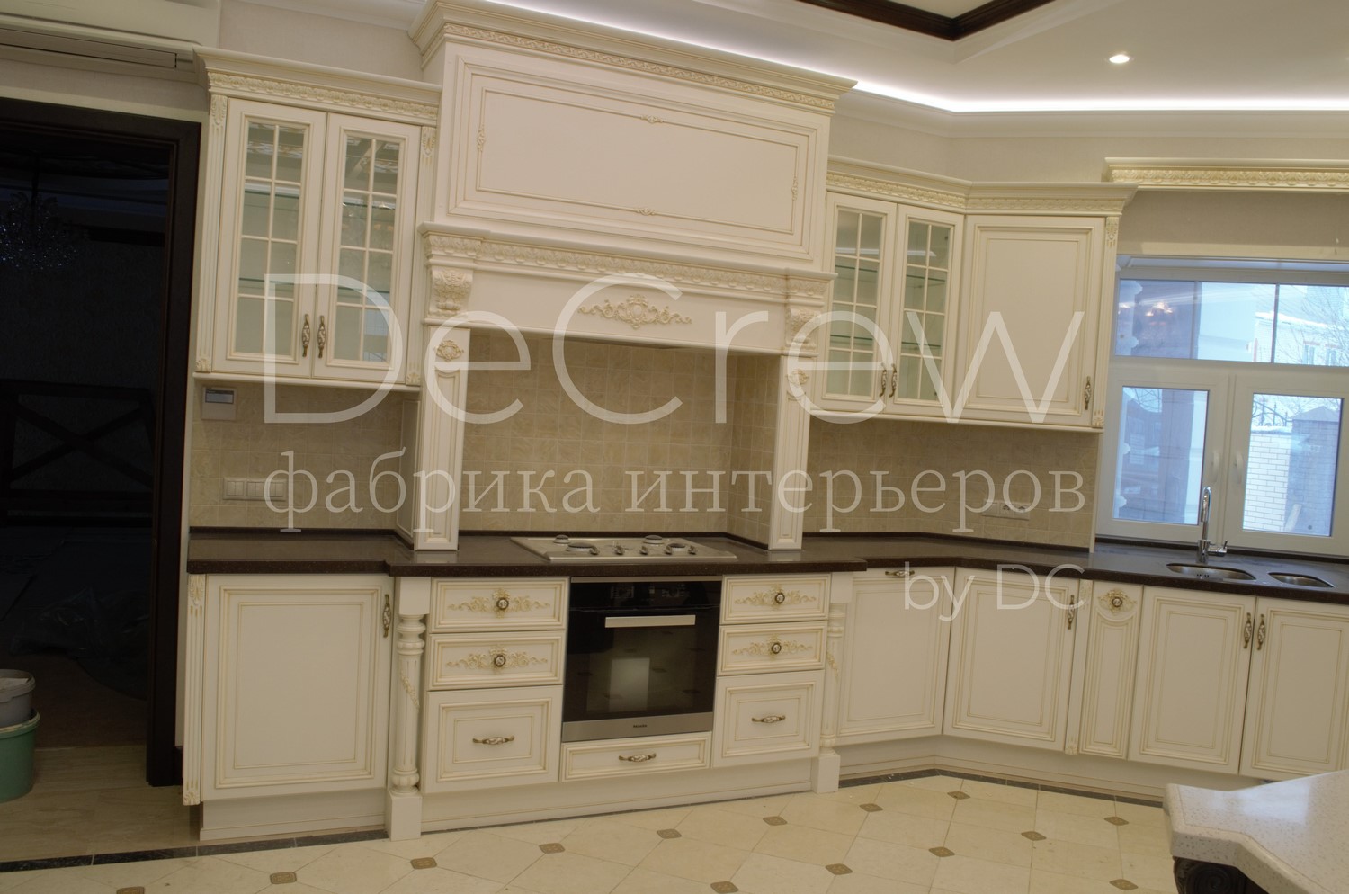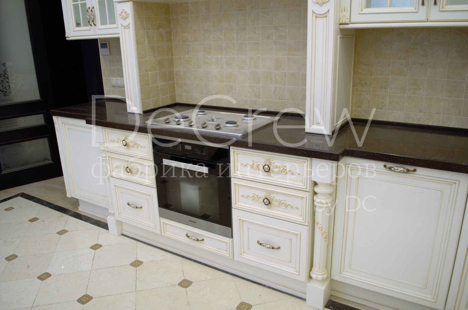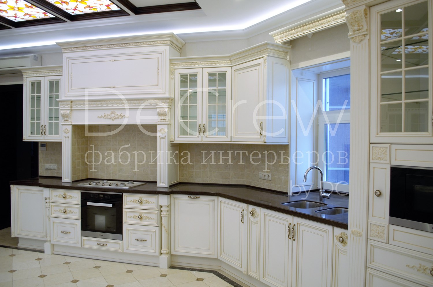 Корпус кухни, в стандартном исполнении, выполнен из влагостойкого ЛДСП Egger. Восможно так же варианты исполнения корпуса из шпонированного МДФ и массива. Фасады,цоколь,карнизы и декоративные элементы выполненны из массива ясени. Феленки фасадов - МДФ шпонированные. Для отделки применяются лакокрасочные материалы Hesse, Renner. Фурнитура используется различных фирм по пожежеланиям заказчика. Возможна коррекция дизайна.Цветовая гамма техника и стиль отделки подбираются индивидуально.