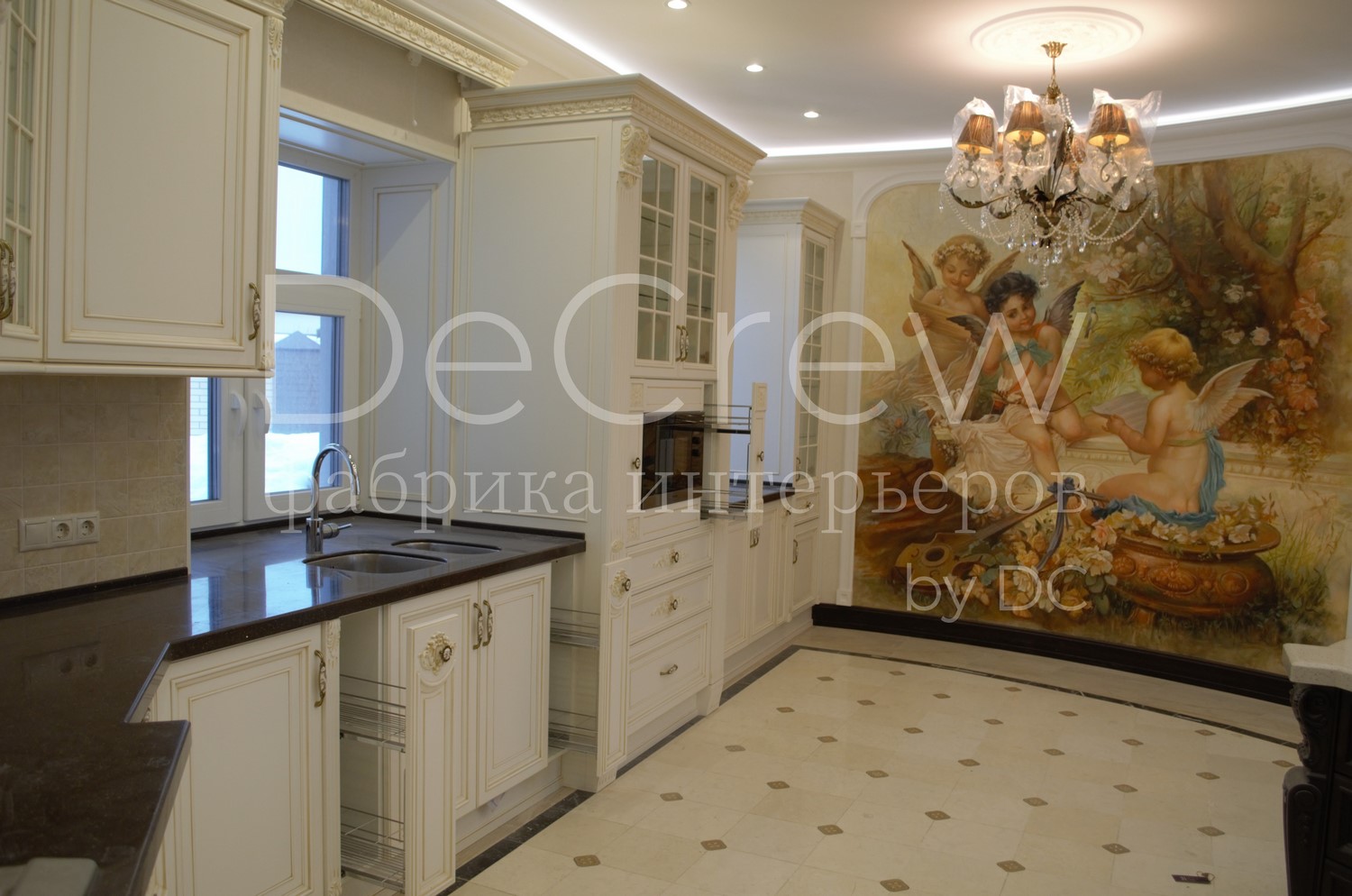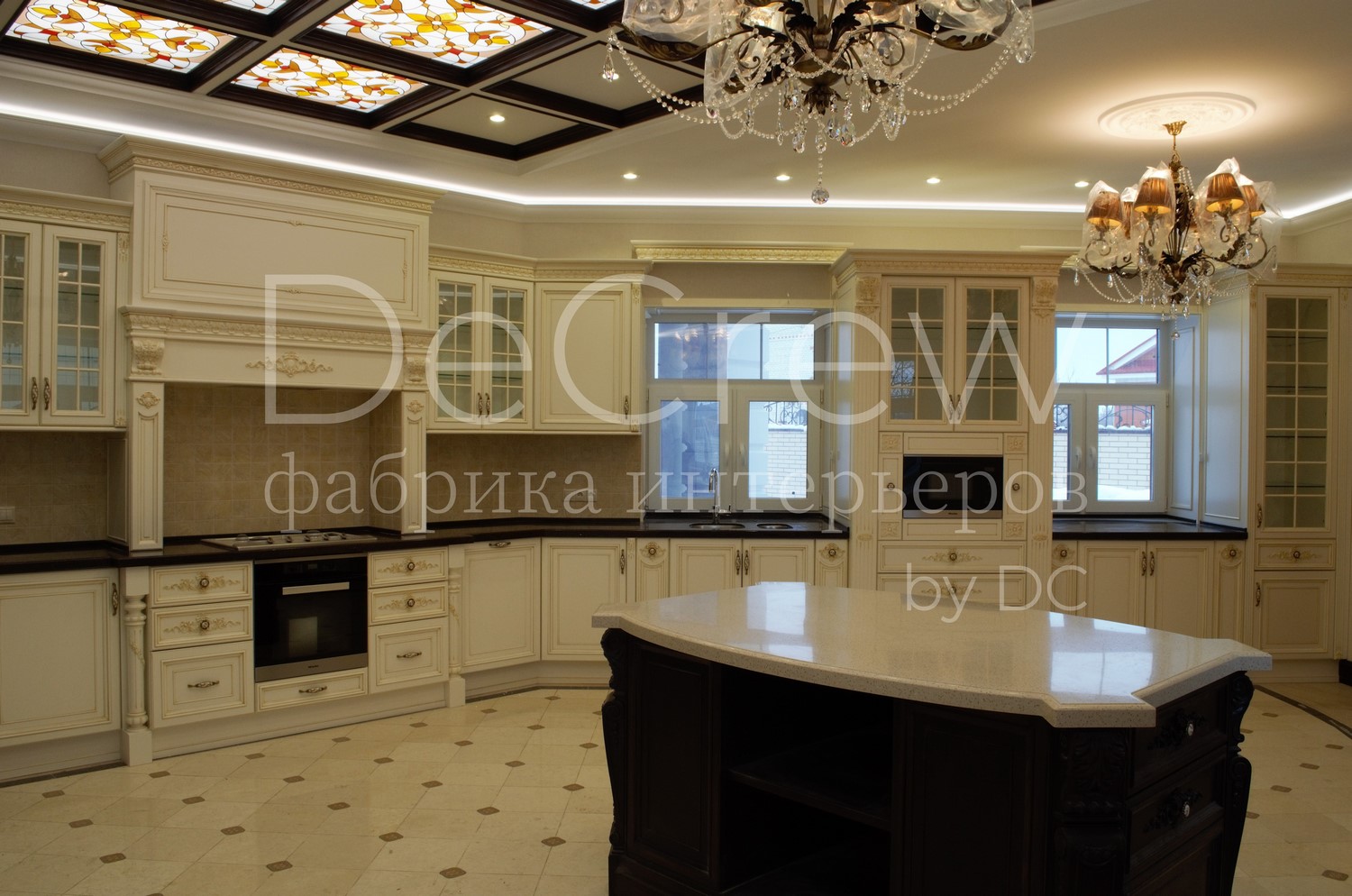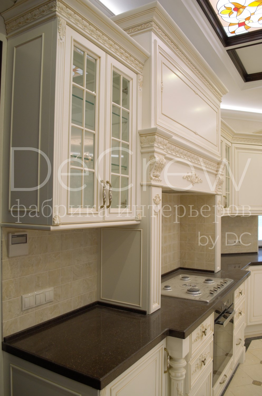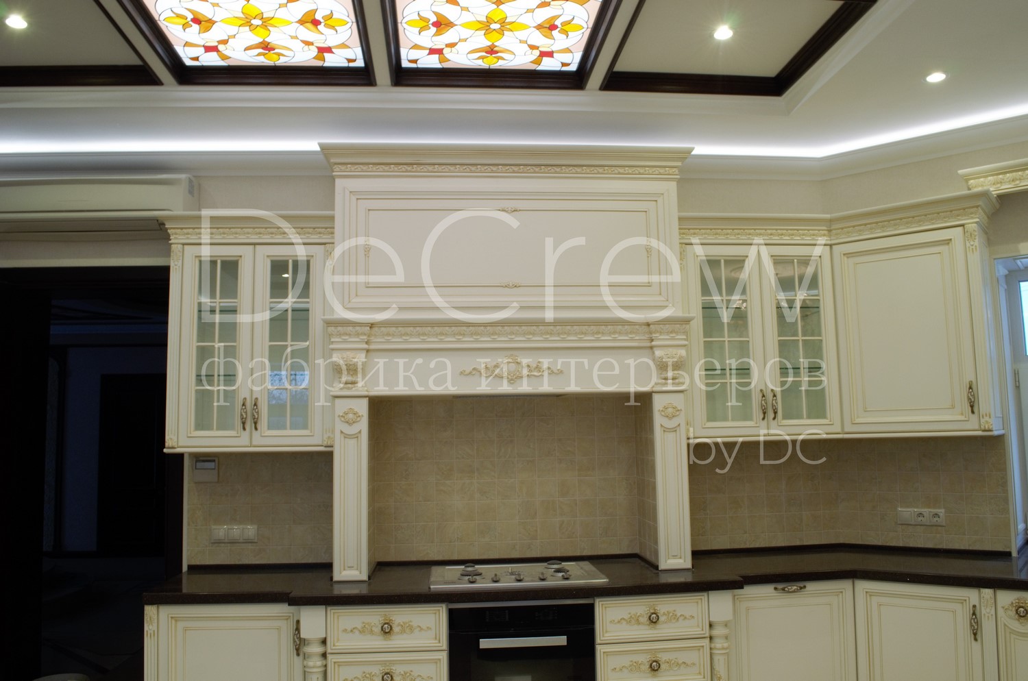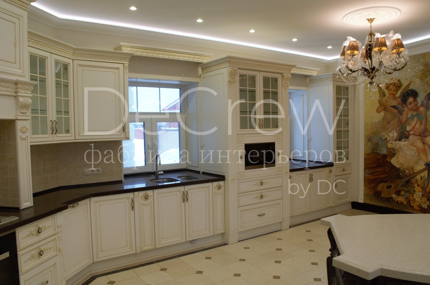 Корпус кухни, в стандартном исполнении, выполнен из влагостойкого ЛДСП Egger. Восможно так же варианты исполнения корпуса из шпонированного МДФ и массива. Фасады,цоколь,карнизы и декоративные элементы выполненны из массива ясени. Феленки фасадов - МДФ шпонированные. Для отделки применяются лакокрасочные материалы Hesse, Renner. Фурнитура используется различных фирм по пожежеланиям заказчика. Возможна коррекция дизайна.Цветовая гамма техника и стиль отделки подбираются индивидуально.