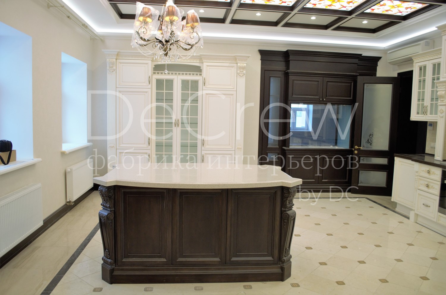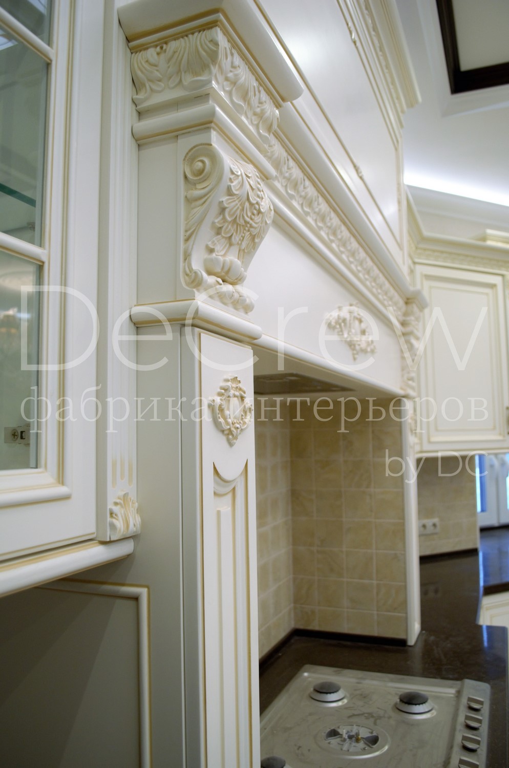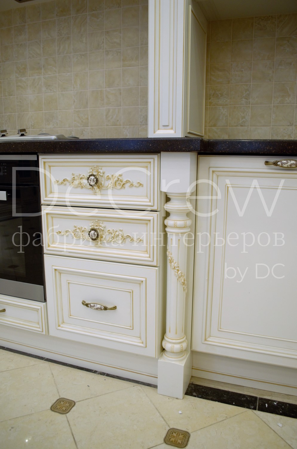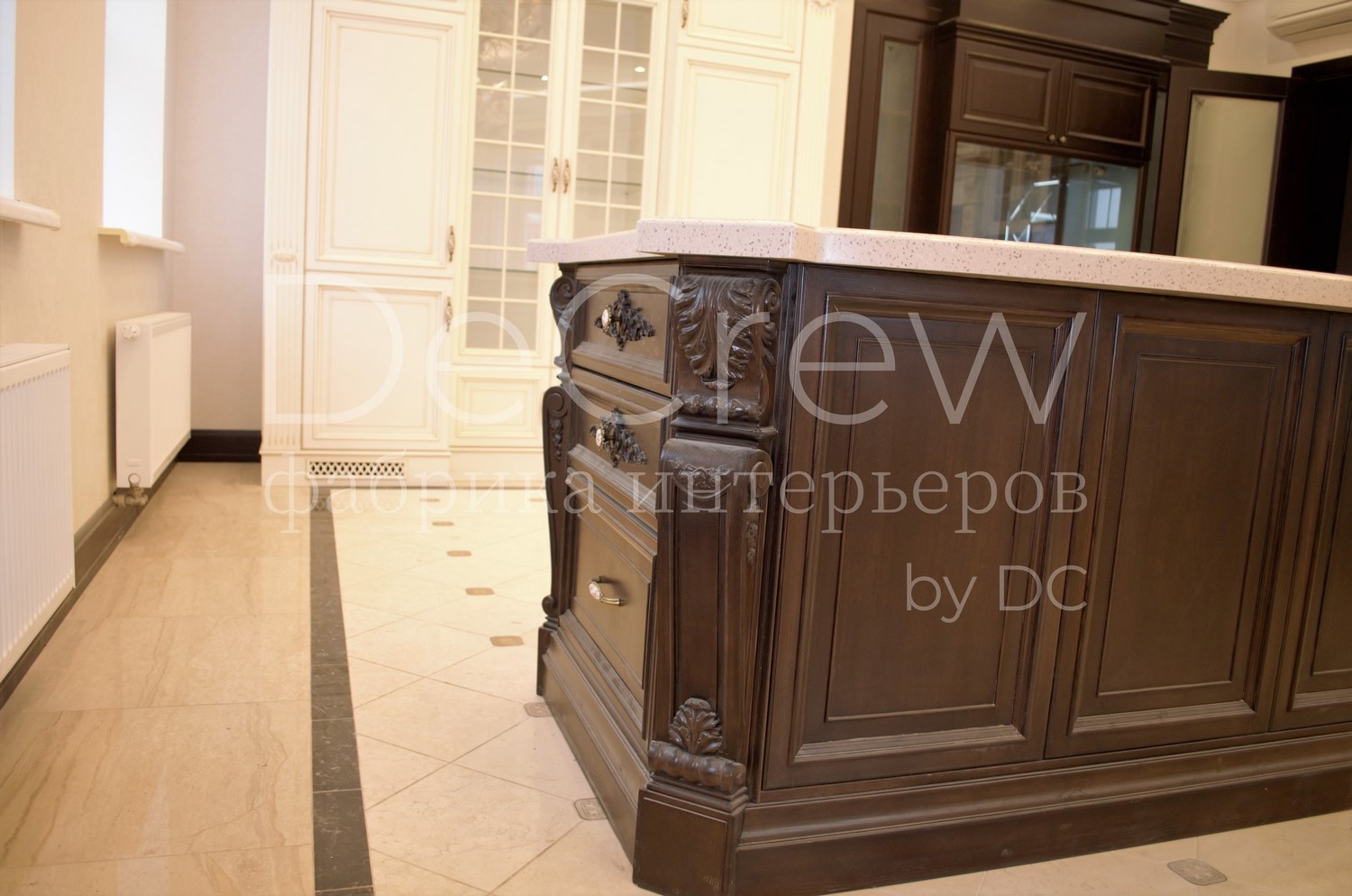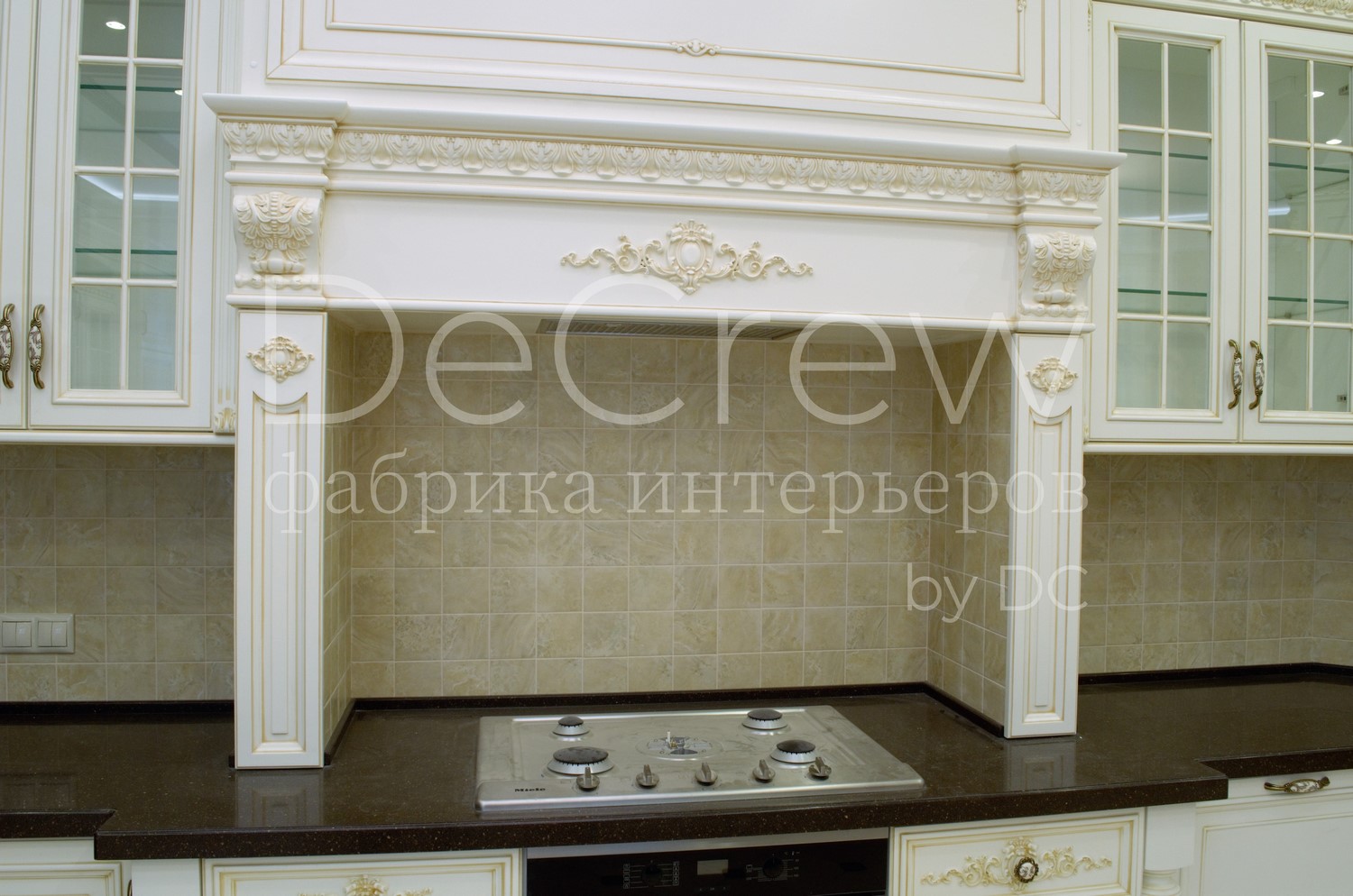 Корпус кухни, в стандартном исполнении, выполнен из влагостойкого ЛДСП Egger. Восможно так же варианты исполнения корпуса из шпонированного МДФ и массива. Фасады,цоколь,карнизы и декоративные элементы выполненны из массива ясени. Феленки фасадов - МДФ шпонированные. Для отделки применяются лакокрасочные материалы Hesse, Renner. Фурнитура используется различных фирм по пожежеланиям заказчика. Возможна коррекция дизайна.Цветовая гамма техника и стиль отделки подбираются индивидуально.