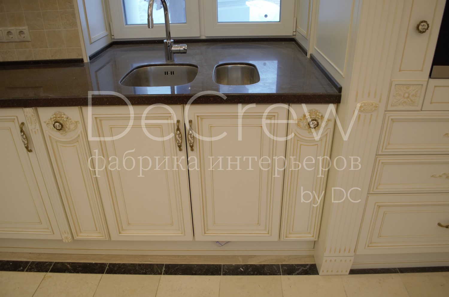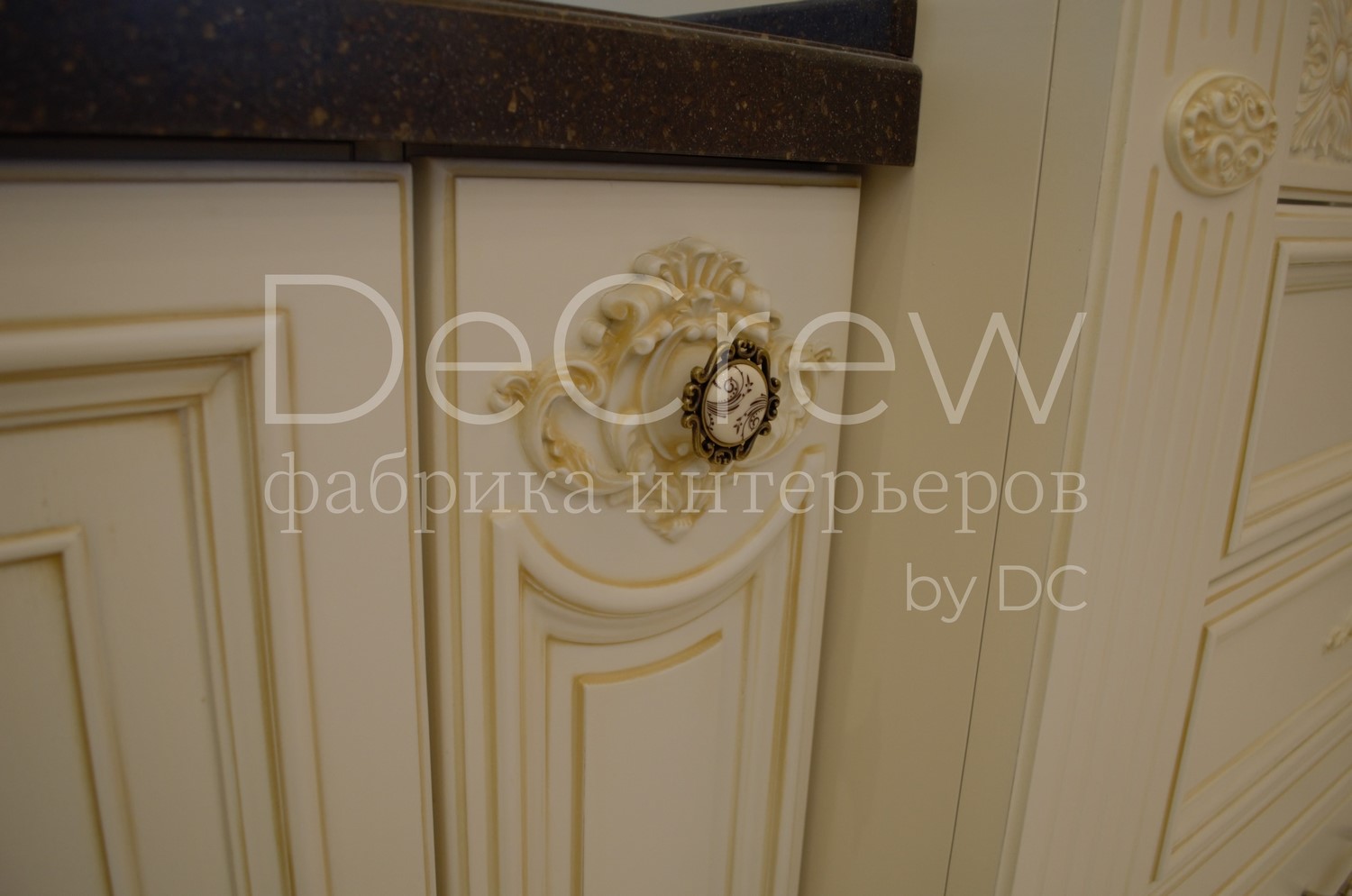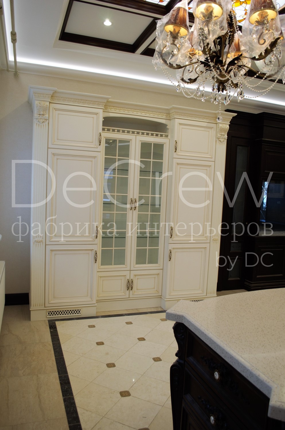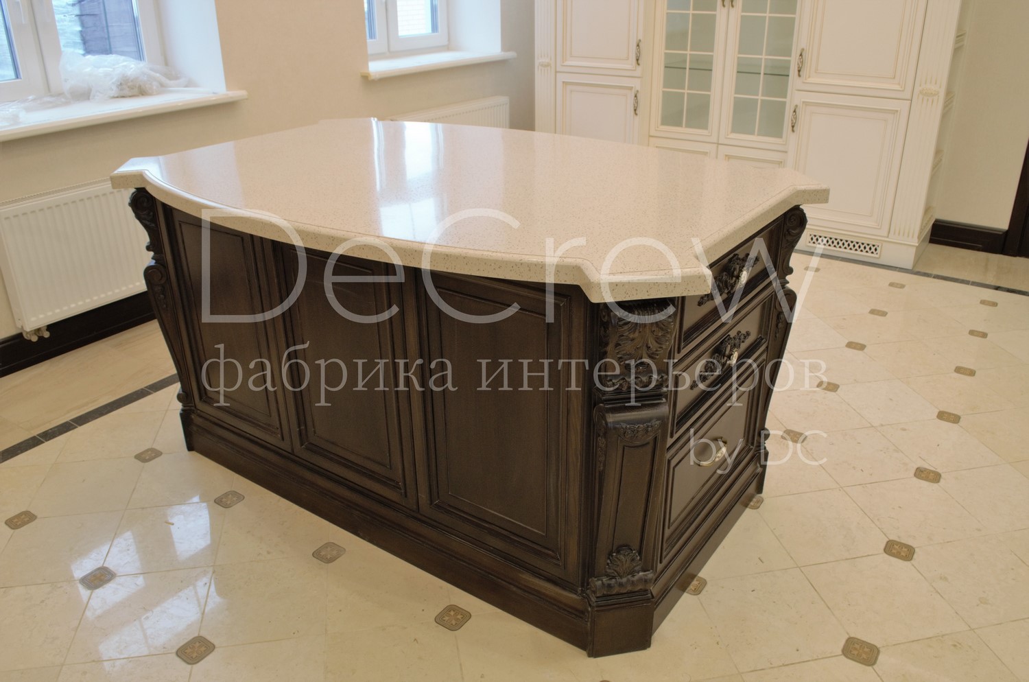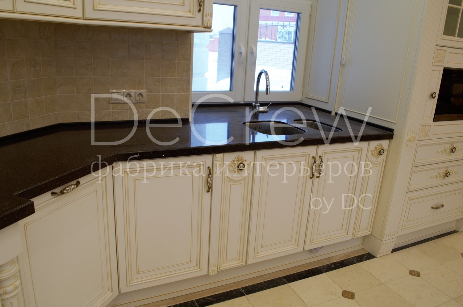 Корпус кухни, в стандартном исполнении, выполнен из влагостойкого ЛДСП Egger. Восможно так же варианты исполнения корпуса из шпонированного МДФ и массива. Фасады,цоколь,карнизы и декоративные элементы выполненны из массива ясени. Феленки фасадов - МДФ шпонированные. Для отделки применяются лакокрасочные материалы Hesse, Renner. Фурнитура используется различных фирм по пожежеланиям заказчика. Возможна коррекция дизайна.Цветовая гамма техника и стиль отделки подбираются индивидуально.