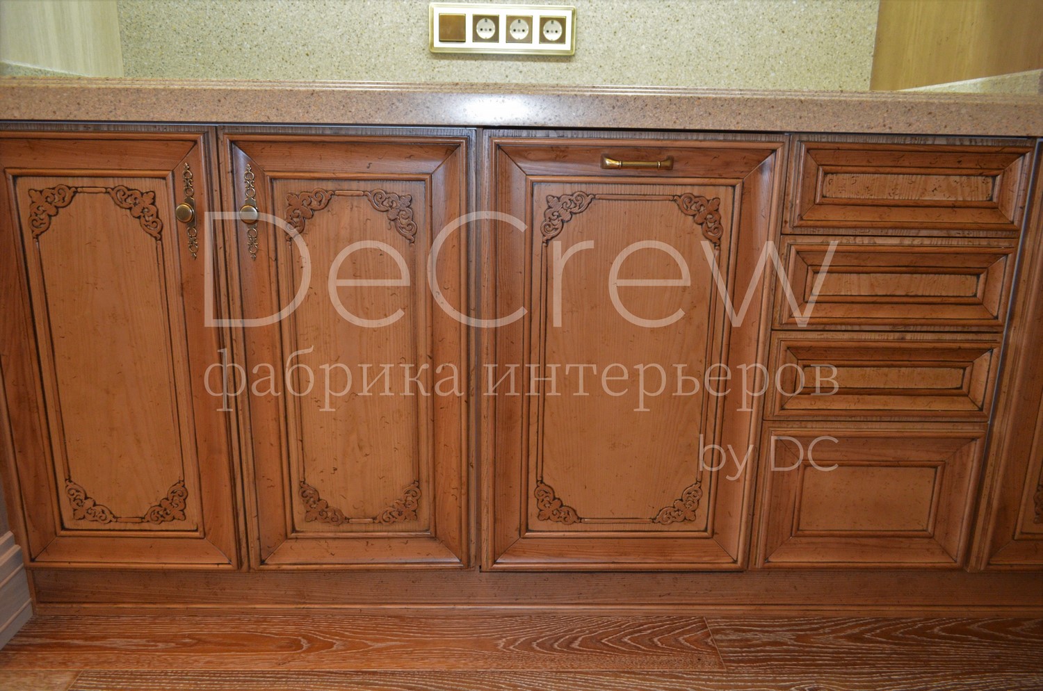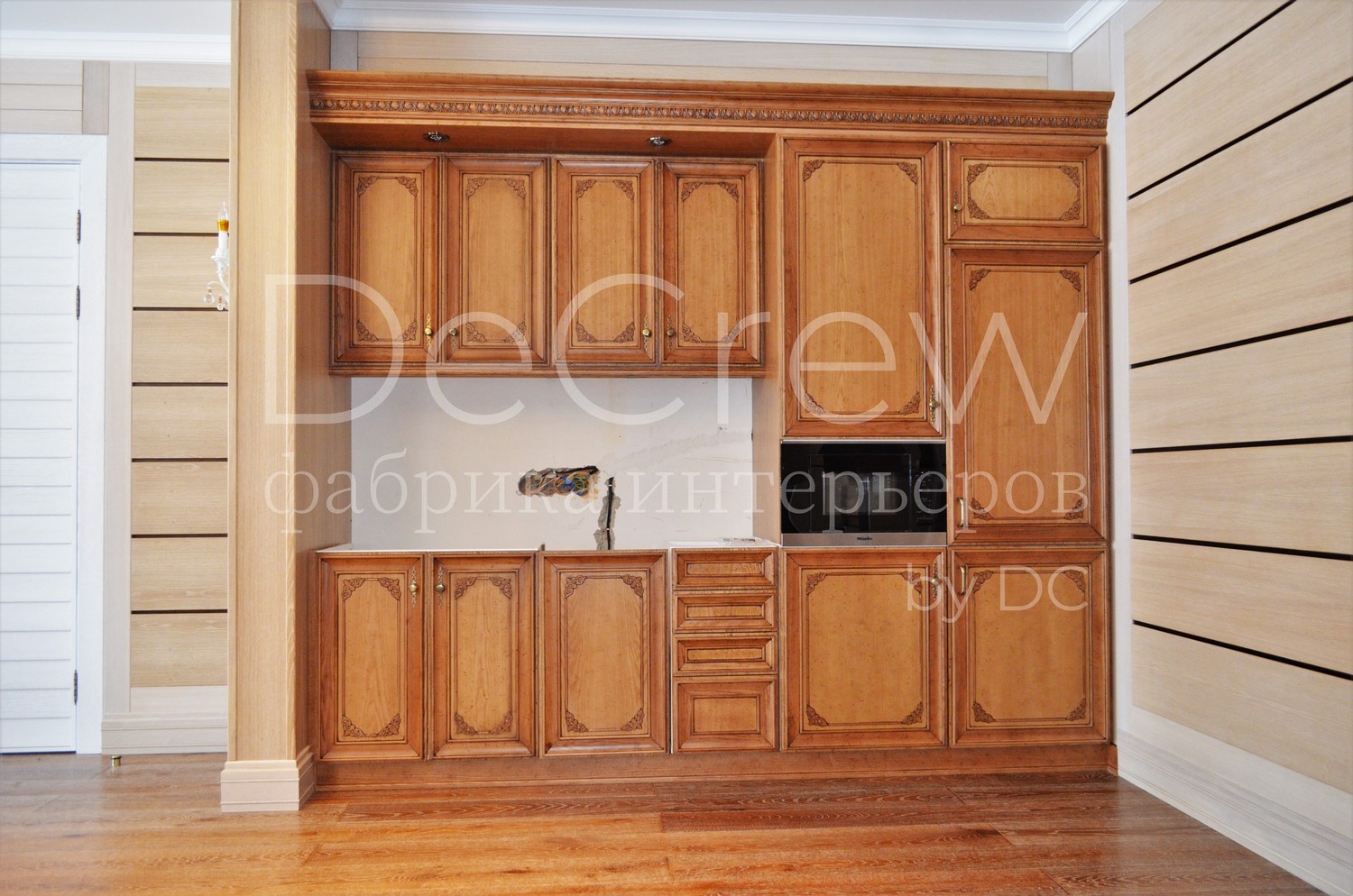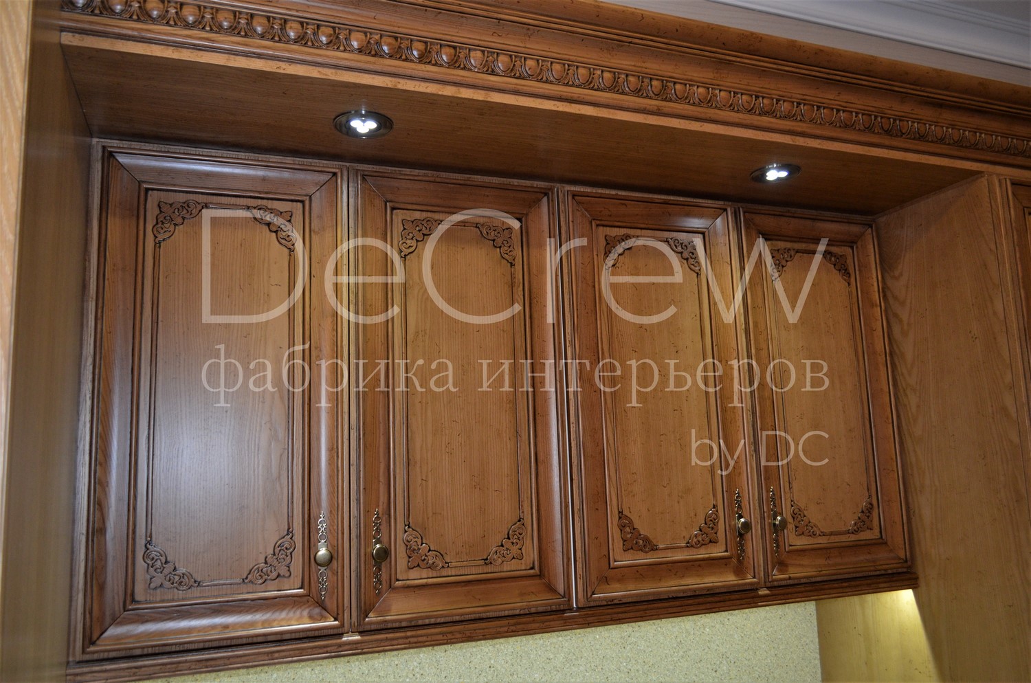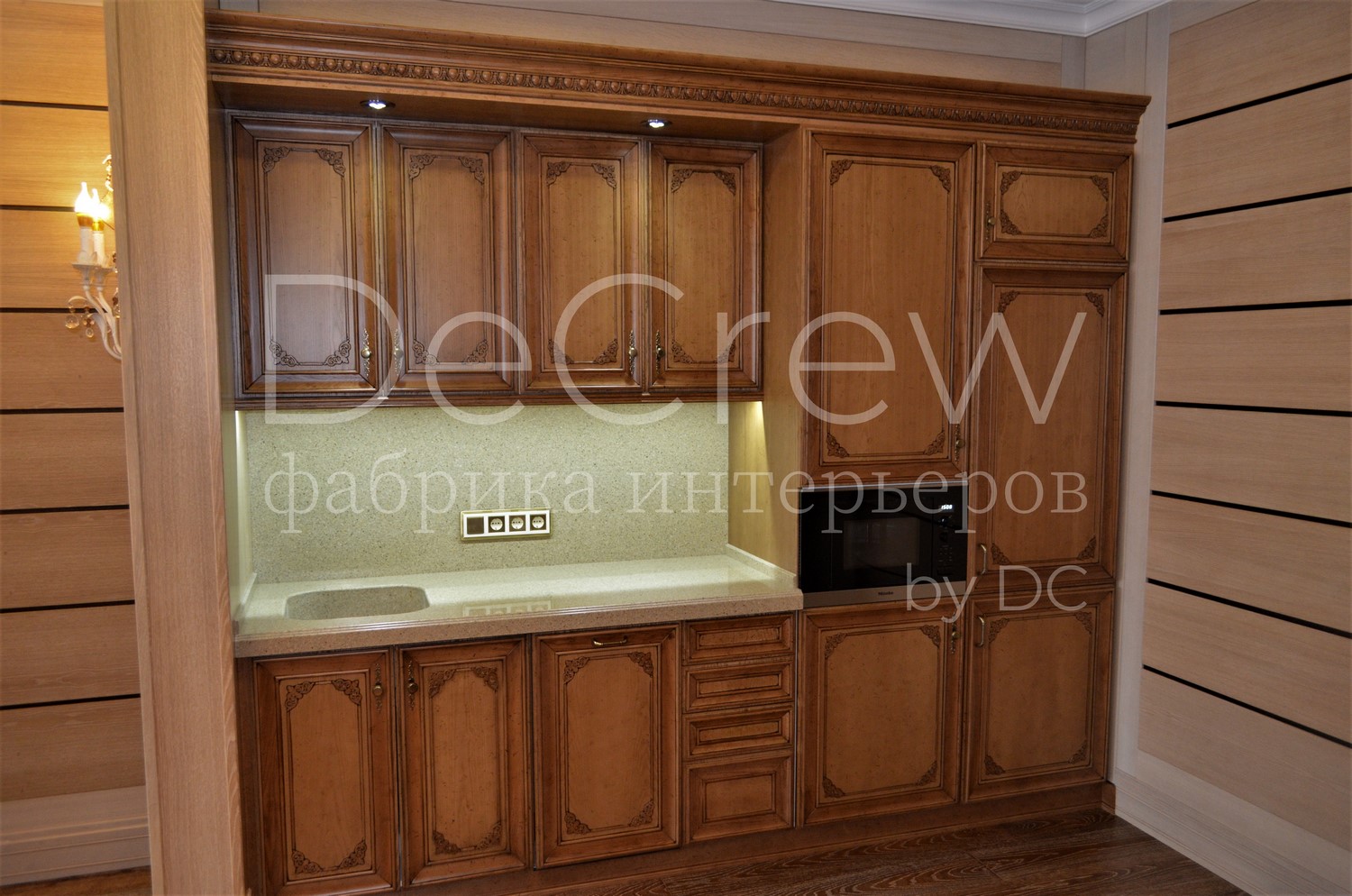 Корпус кухни, в стандартном исполнении, выполнен из влагостойкого ЛДСП Egger. Восможно так же варианты исполнения корпуса из шпонированного МДФ и массива. Фасады,цоколь,карнизы и декоративные элементы выполненны из массива ясени. Феленки фасадов - МДФ шпонированные. Для отделки применяются лакокрасочные материалы Hesse, Renner. Фурнитура используется различных фирм по пожежеланиям заказчика. Возможна коррекция дизайна.Цветовая гамма техника и стиль отделки подбираются индивидуально.