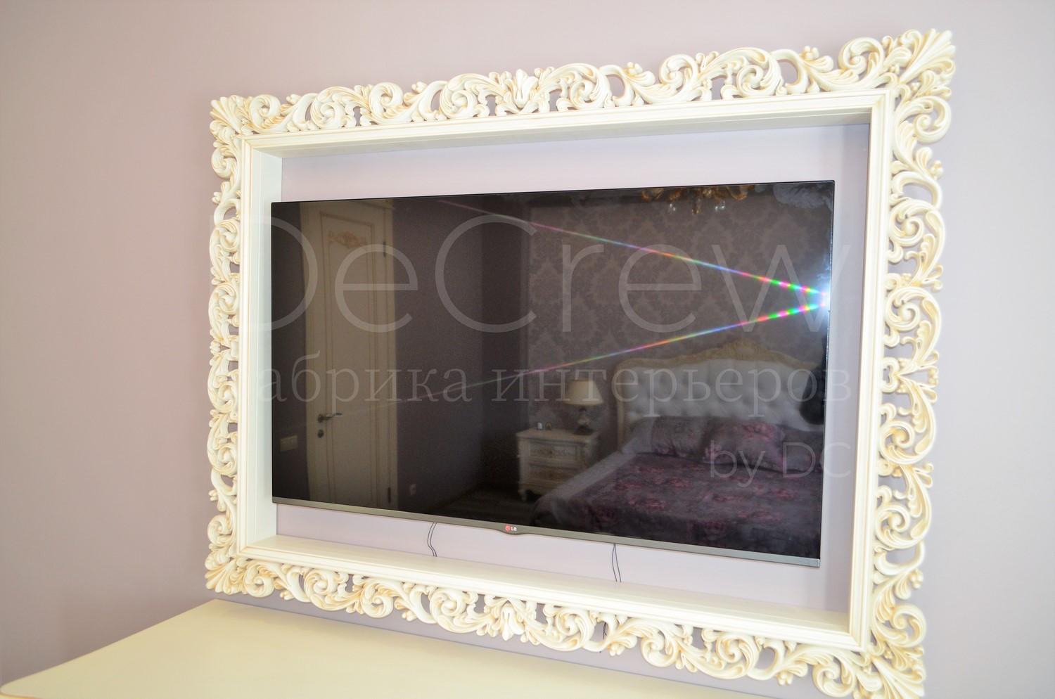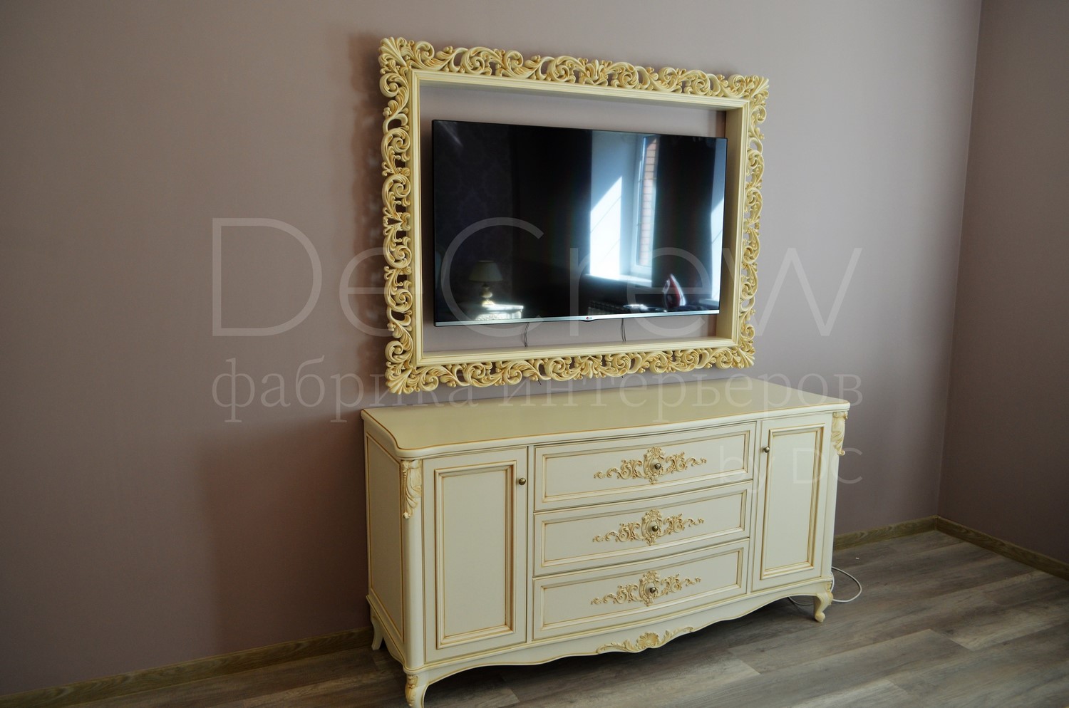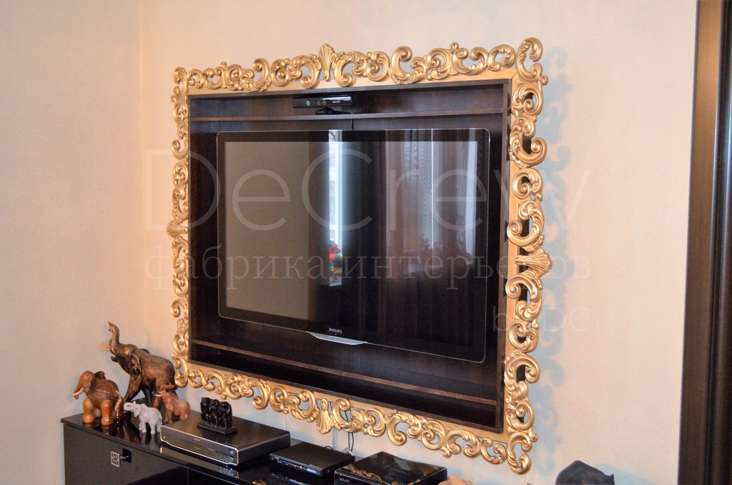 Стойка TV двухсторонная, стилизованная под конкретный набор мебели,произвенной в Италии. Продумана конструкция таким образом, что все провода и крепления не видны, но доступны для обслуживания.