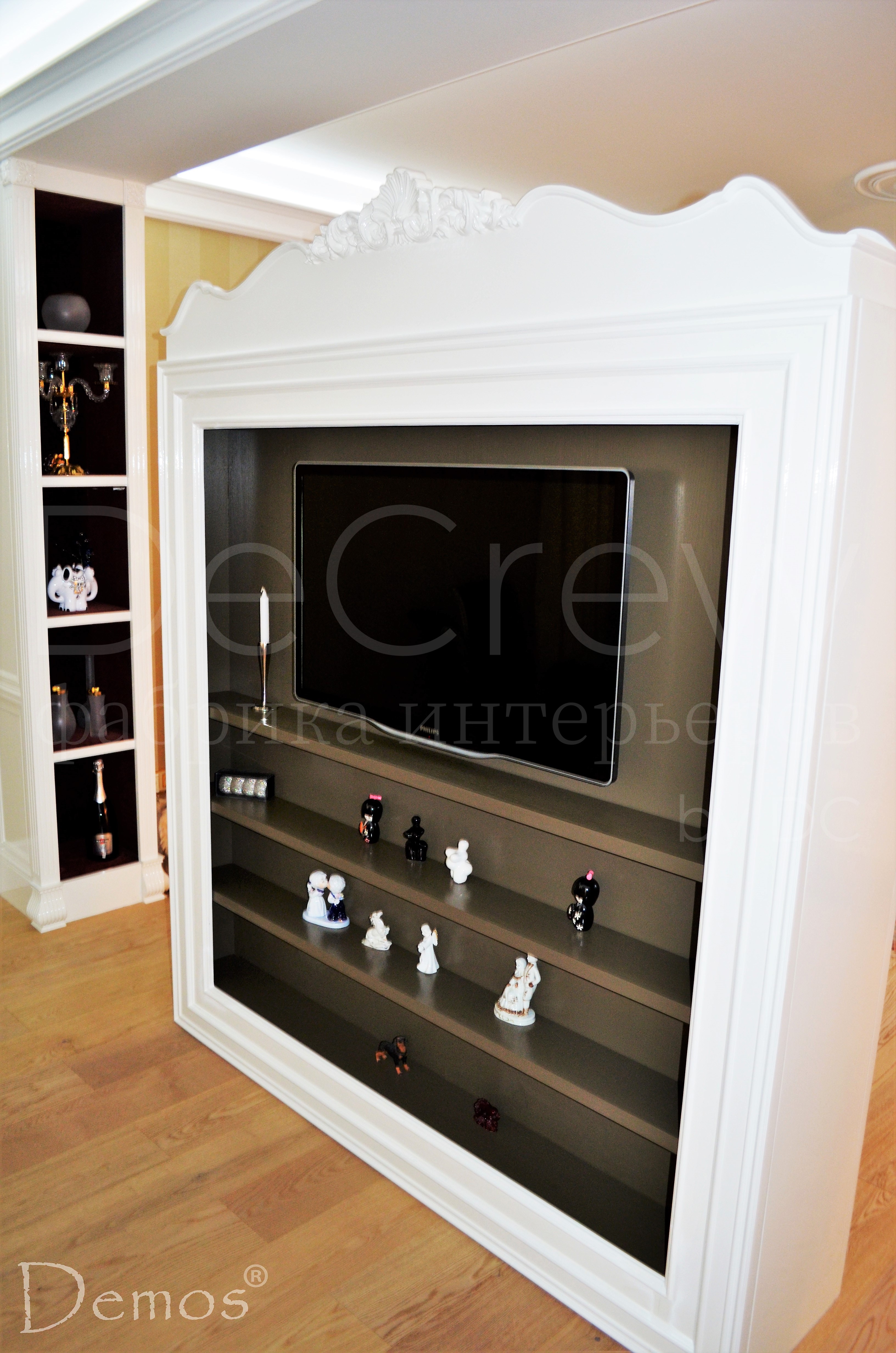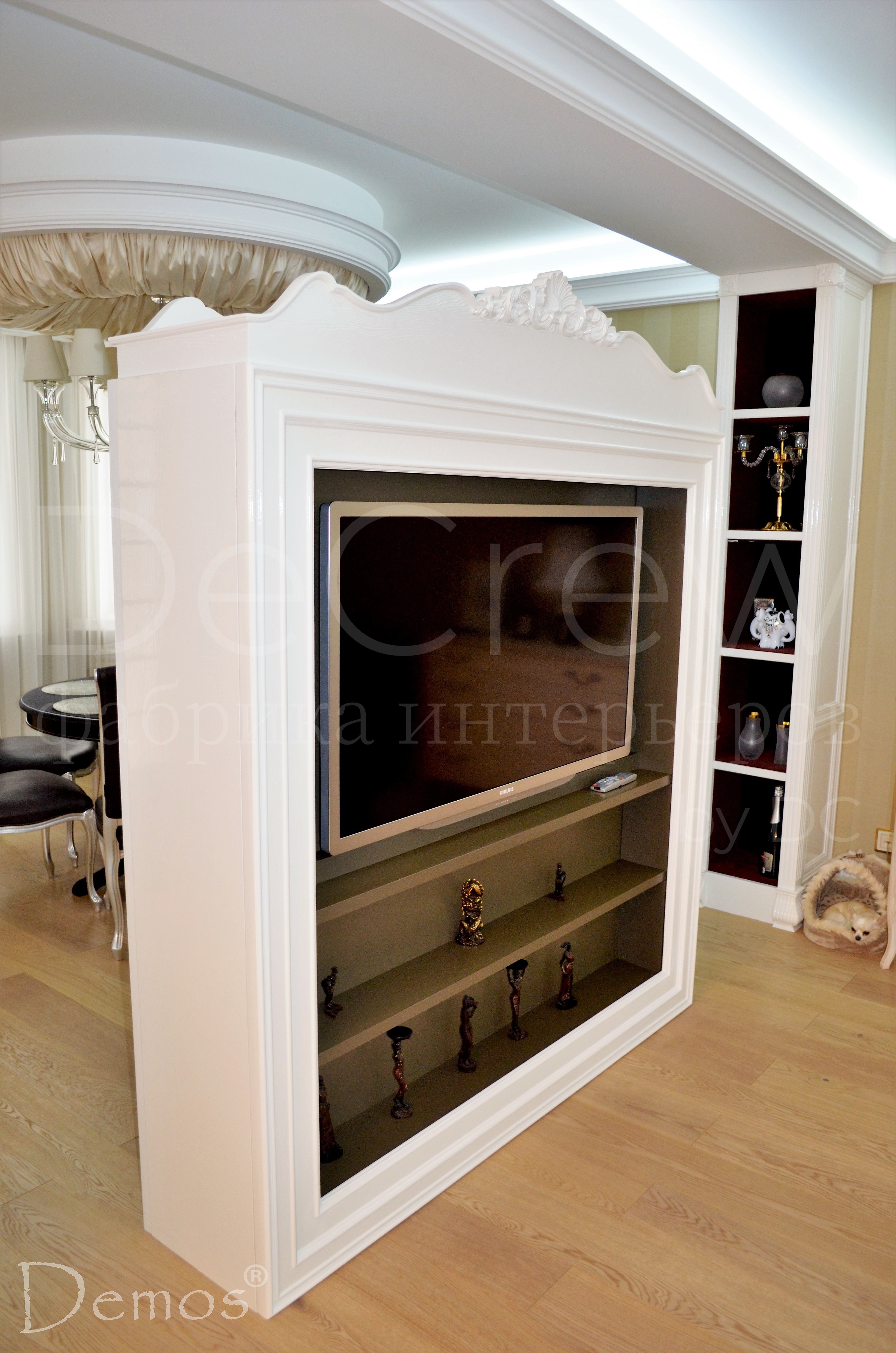 Стойка TV двухсторонная, стилизованная под конкретный набор мебели,произвенной в Италии. Продумана конструкция таким образом, что все провода и крепления не видны, но доступны для обслуживания.